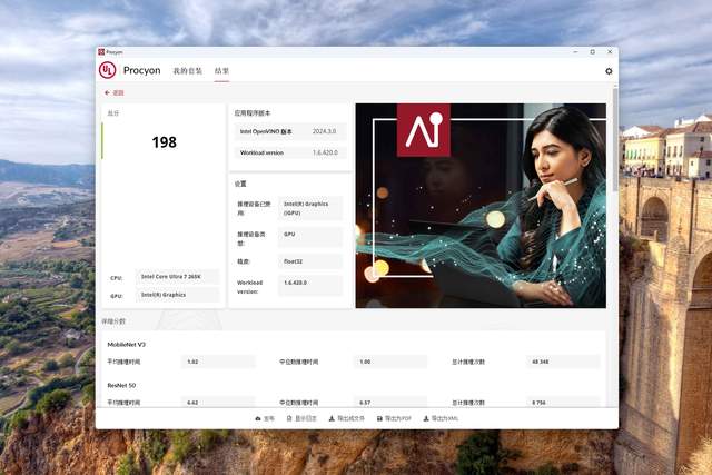 其次是代表CPU+显卡影音AI性能的UL Proycon,使用WindowsML,测试结果如下图所示: