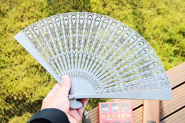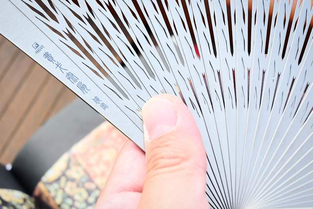 钛扇大体可分为两大类,一种只是把钛合金当作骨架,扇面还是传统苏宣的钛扇,我们仍然可以在上面题字作画,扇风使用。另一类则是整把扇均为钛合金所制,扇骨也是扇面,辅以镂空、浮雕、镶金等多种复杂工艺,更适合拿来收藏。而我手上这把“凤羽”就是后者,即全钛扇。