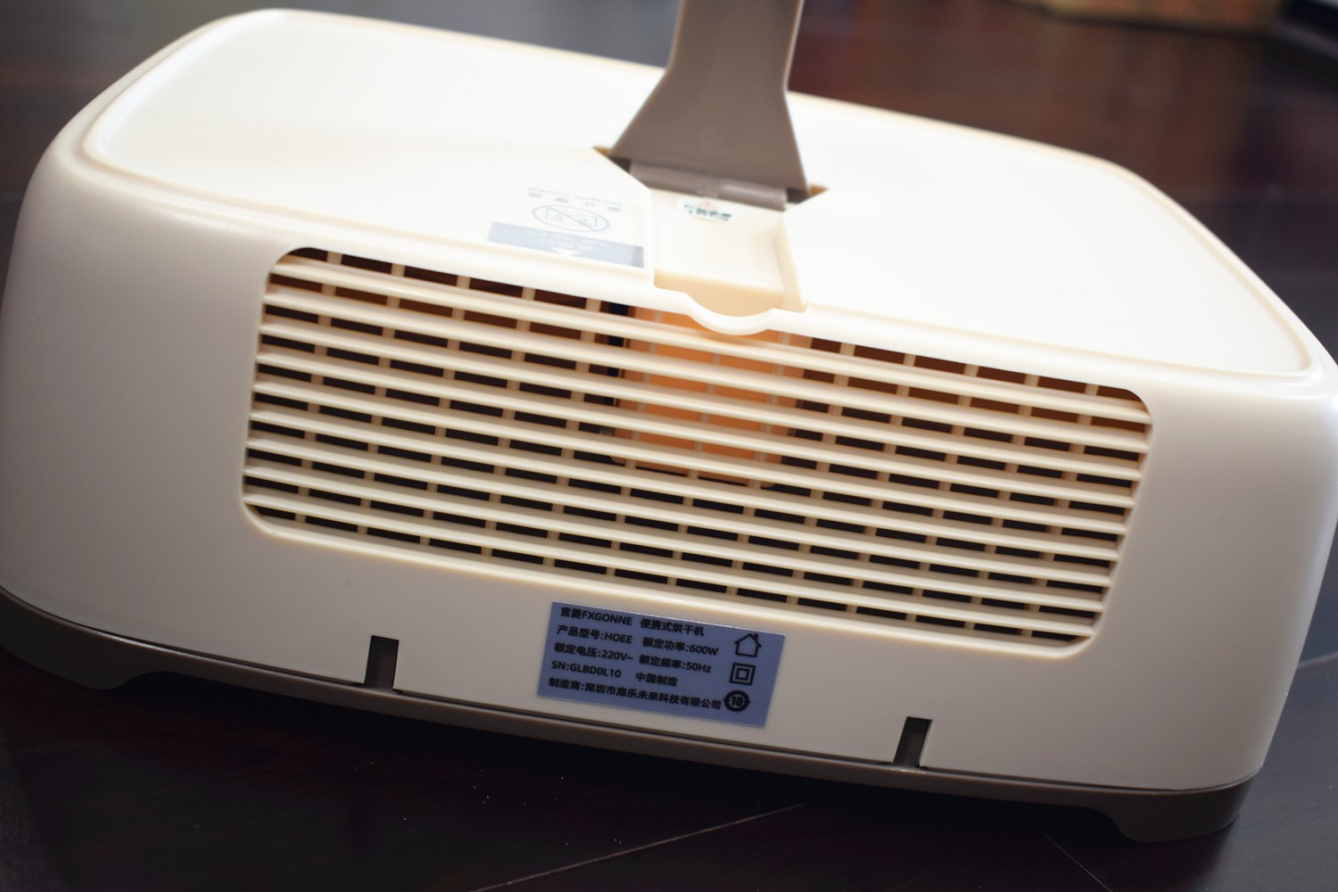 这款宫菱家用便携烘干机个头不大,主机也就300*225*103mm这样一个尺寸。如果大家没有直观概念,可以想像着和297*210mm的A4纸比较一下,这款烘干机仅比A4纸略大一点点,而且重量仅为1100克,居家移动、差旅携带都非常方便。