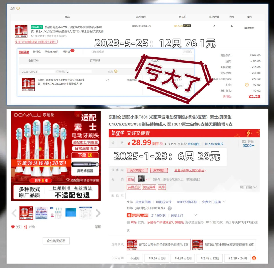 查了京东订单记录,当时发现能适配素士X3(实际上还兼容素士/贝医生 C1/X1/X3/X5/X3U以及小米T301)的刷头只有这款东耐伦无铜植毛6支装。着急入手,就买了两盒共实付76.1元,一共12支,折合一只牙刷头6.3元(购入时间:2023年5月25日)。现在再看,同规格的一盒才29,折合一只才4.83元。