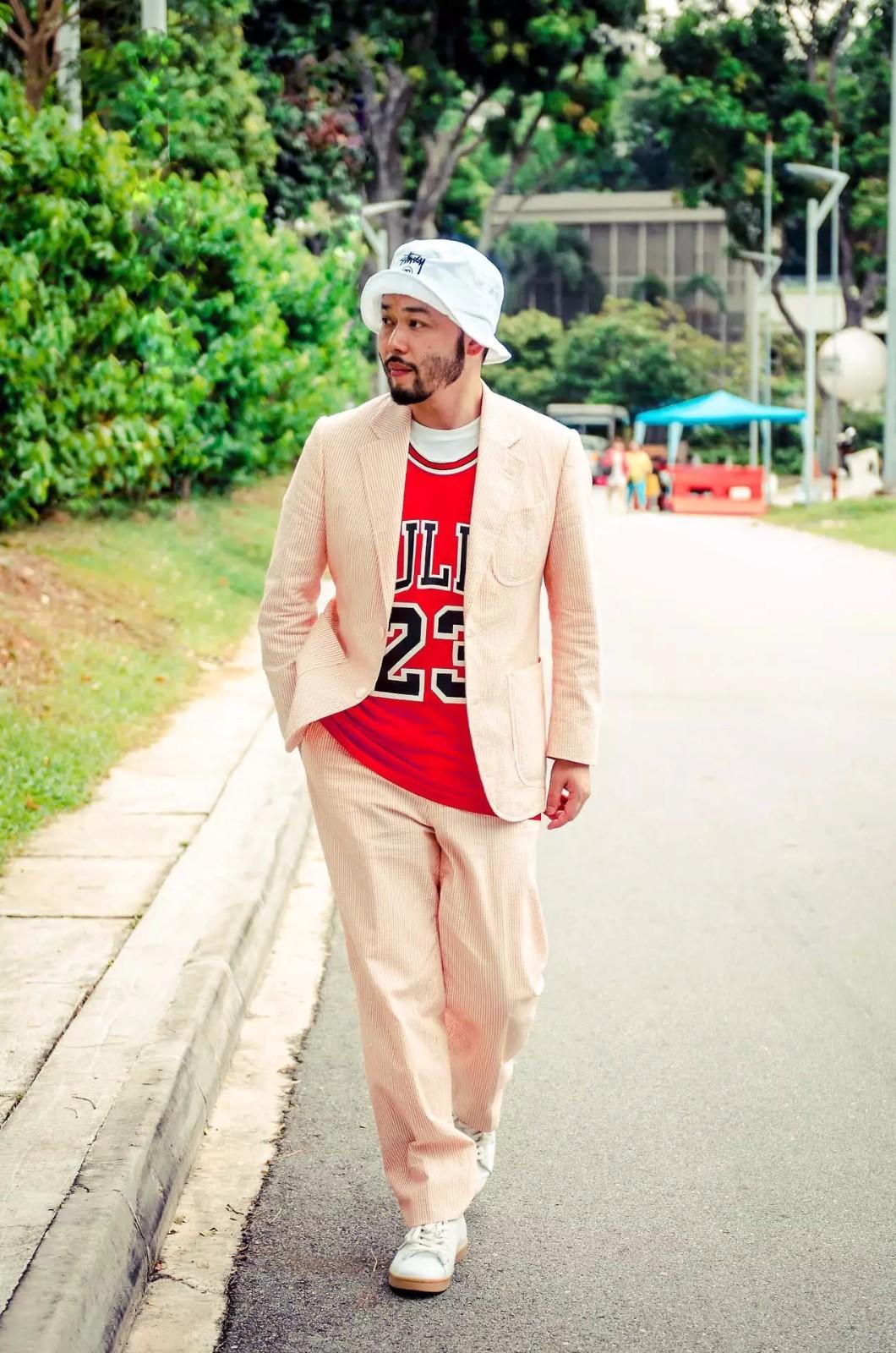 ▲整套宽松的西服内搭球衣,不但毫无违和感还呈现出浓烈的街头休闲的气息。