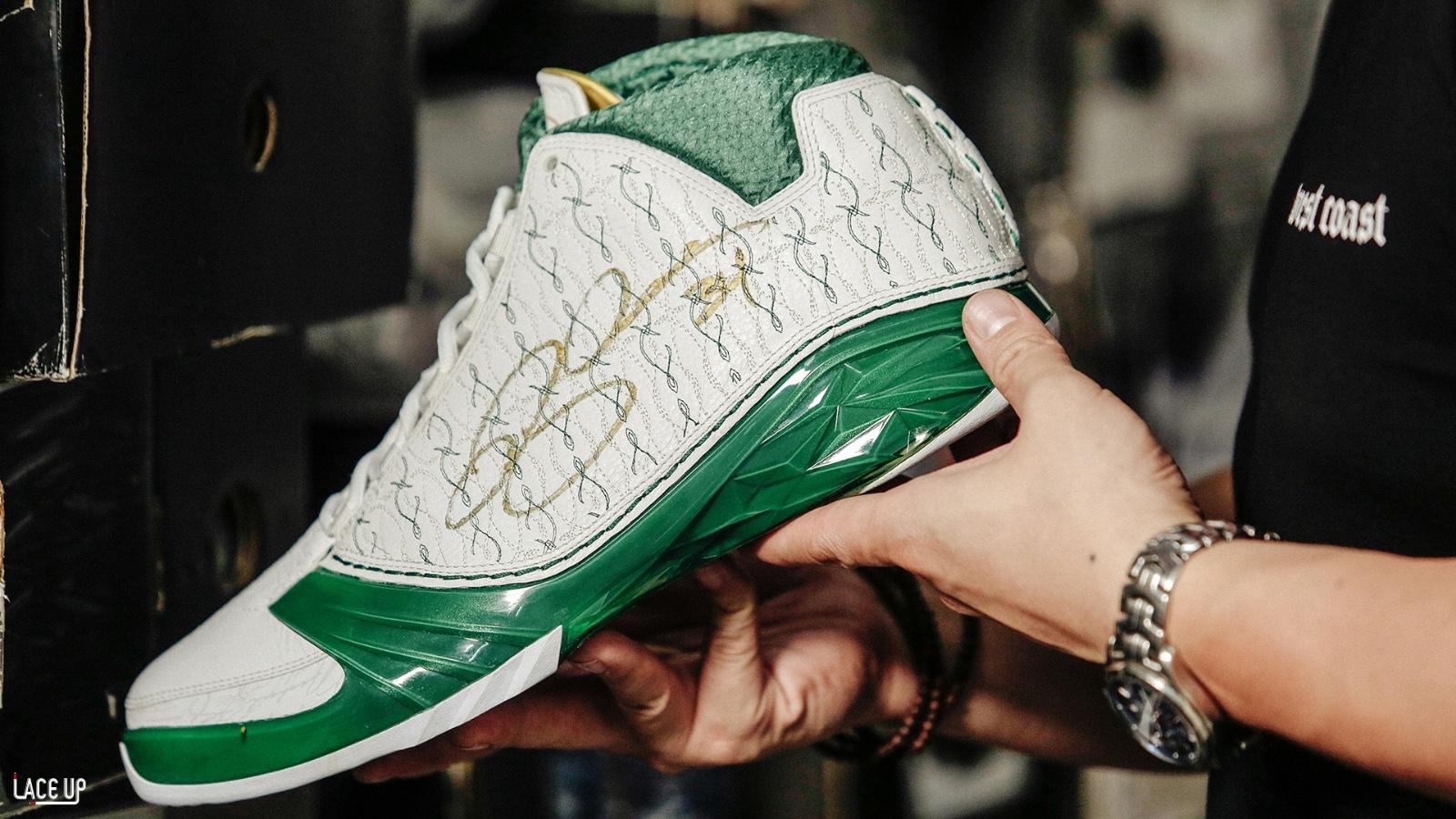 在这最珍贵的一百多双鞋中,Jason给我们展示了一双Air Jordan 23 Ray Allen PE,上面的双签是Jason亲自带到雷阿伦面前签到的,雷阿伦当时看到这双鞋的时候也很开心,因为本身这双鞋就很难买到的,现在又加上了雷阿伦的亲签,这一切都太美妙了。