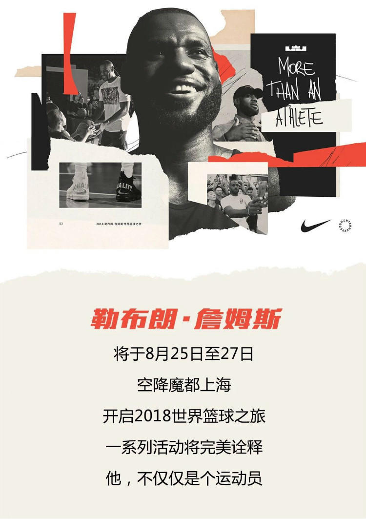 除了紫金战袍和联名鞋款之外,据悉今年的詹姆斯中国行,还将以“More than an athlete (不仅仅是一名运动员)”为主题,围绕体育、电影和潮流展开丰富而精彩的活动,值得期待!