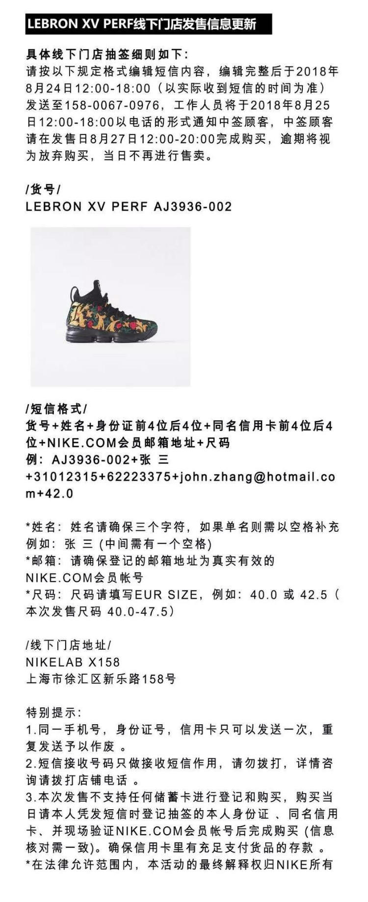 这双华丽与霸气尽显的KITH x Nike LeBron 15采用短信抽签的形式进行发售,且线下发售的门店仅有上海市徐汇区新乐路158号的NIKELAB X 158一家,上海的詹密有福了!本次短信抽签活动的完整登记流程已在Nike官方最新的推文中释出,如下图所示: