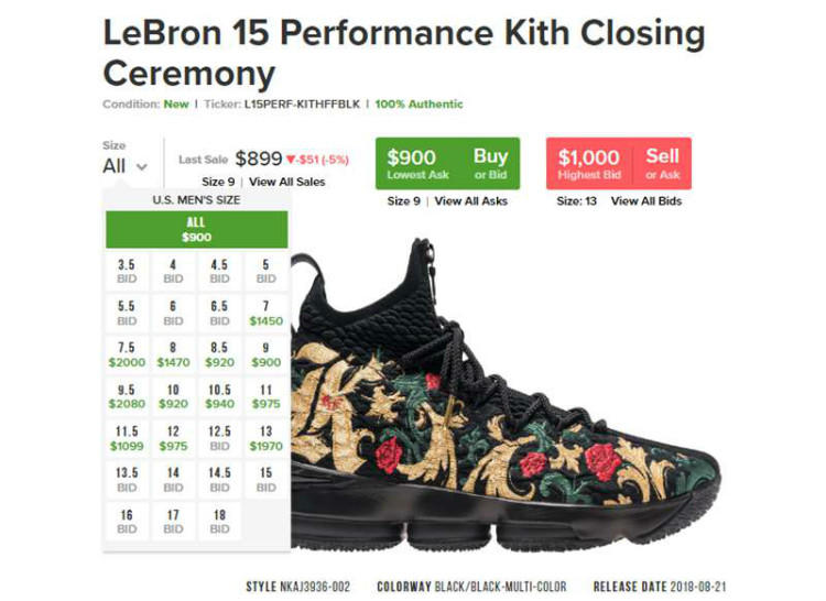 联名的身份、稀少的货量、精美的刺绣、华丽的外观都共同将这双鞋款助推成一双“天价鞋款”——eBay上US 9.5尺码高达$2080美元!相信这双KITH x Nike LeBron 15的发售定将迎来一场“腥风血雨”!