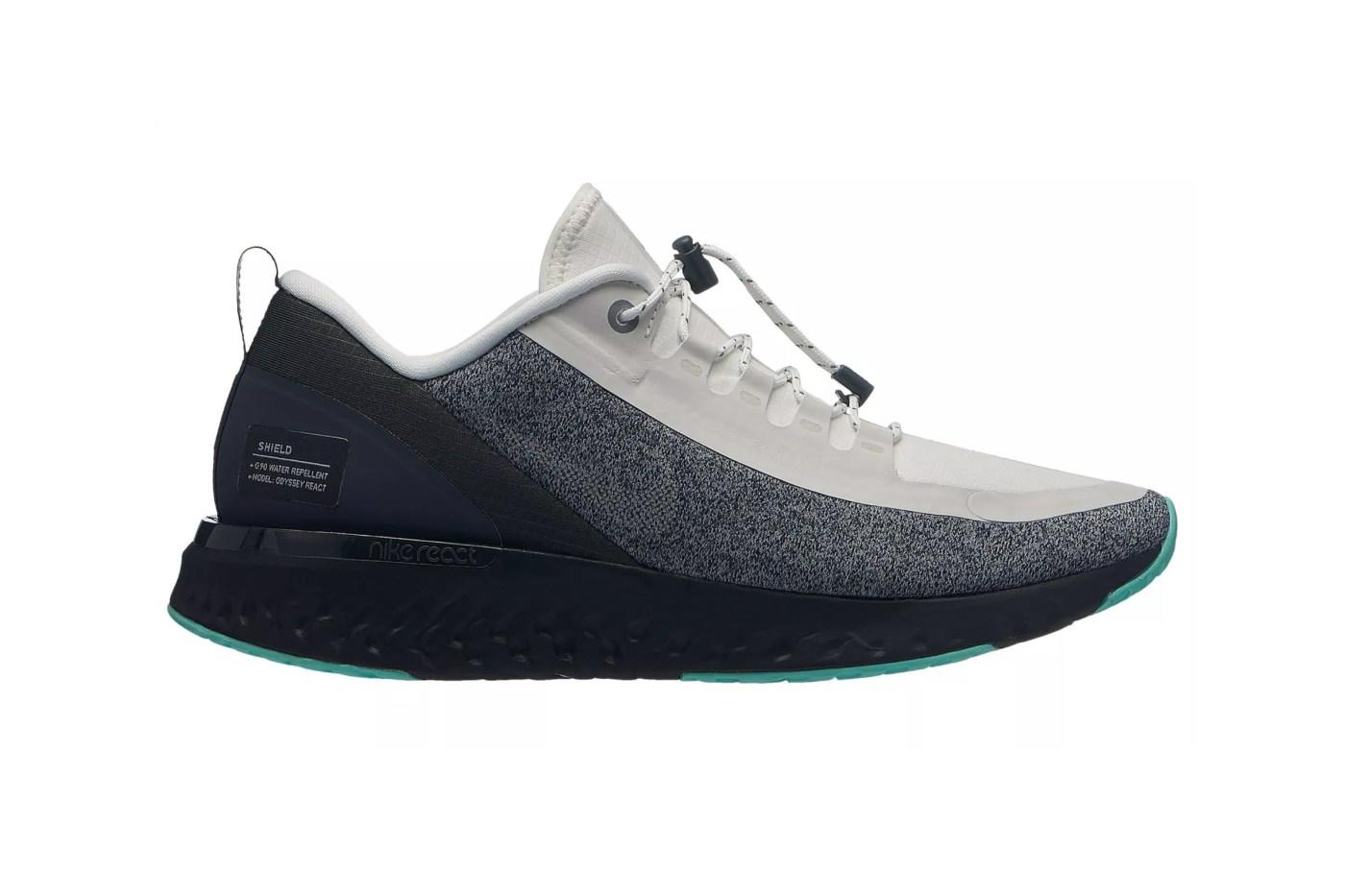 南方沿海地带刚经历完一个超强台风,紧接着 Nike 便为 React 系列追加机能新作,推出以防水为重点的 Odyssey React Shield,让用家们应付任何天气。此系列鞋款采用专有的 G.90 防撕裂材质,采用功能性胶带热焊接缝,更抛弃传统的系带系统,改以索带去调节,牢固地锁住穿着者的脚,搭配着 React 中底系统,令鞋款更舒适缓震。然而目前鞋款却未公布价格,不过据悉将于下月正式发布,届时各位便可入手,遇上风暴雨灾亦不怕外出装备不够机能。