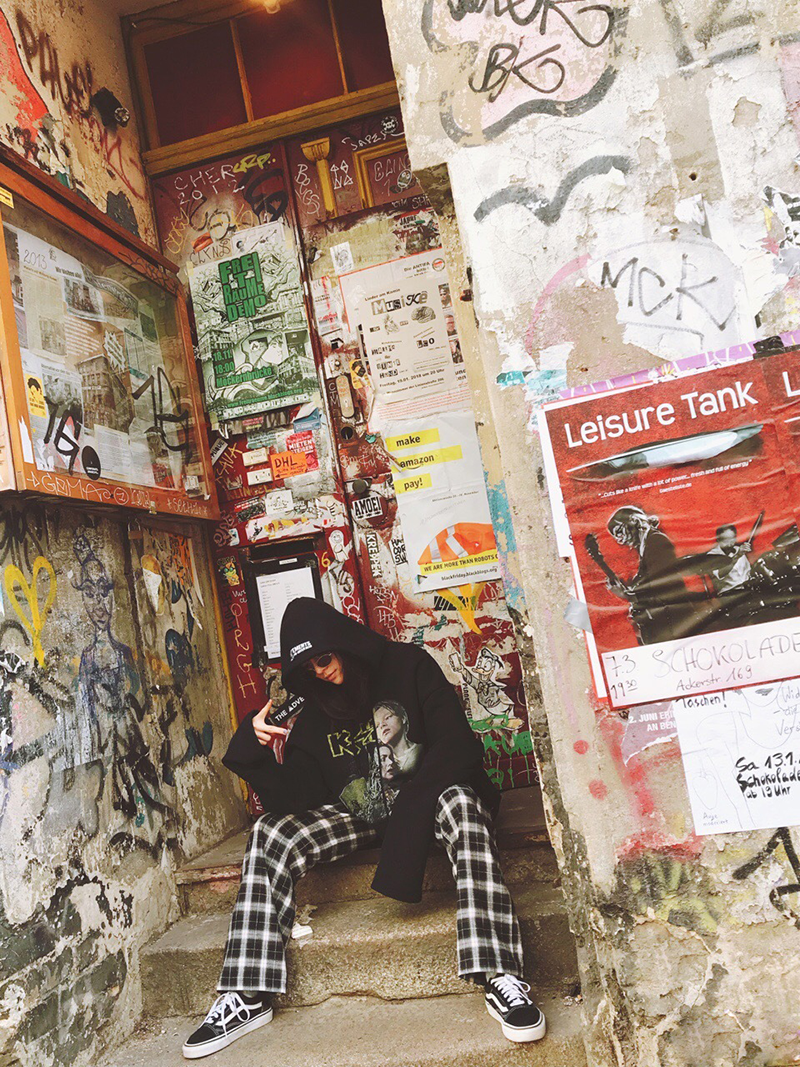 今年最时髦的黑白格子裤子,再加上黑色宽松卫衣,最简单的搭配,已经足够好看了,脚上点缀的是VANS的经典款,之前在校园喜剧《脱单告急》的发布会上也看见了这款鞋的身影