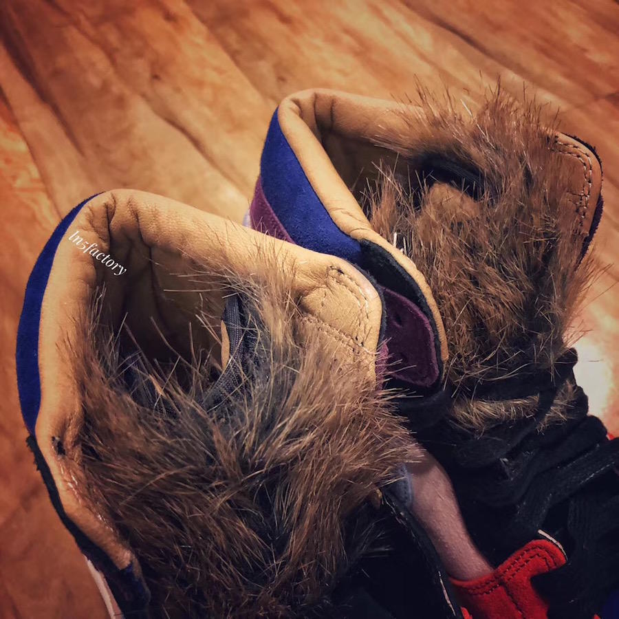 鞋款在配色设计上采用橙色、蓝色、黑色、酒红、淡粉和银色搭配而成。并用翻毛皮材质打造鞋身,质感十足。值得一提的是,双方在鞋舌部分加入了鬃毛元素,颇有冬日感。