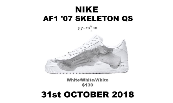 其实早在今年 5 月,网上就曝光了这款 Air Force 1 的设计谍照,当时便引起了不少 Sneakerhead 们的关注。而等待了这么久之后,今日球鞋情报账号 @py_rates 也终于为我们带来了关于它的更多信息:这双鞋款除了在鞋身印有特别的骨头图案之外,鞋底部分还会带有夜光效果,而至于发售信息,据悉它将于 10 月 31 日万圣节期间发售,喜欢的朋友们不妨多多关注。