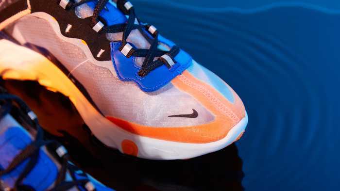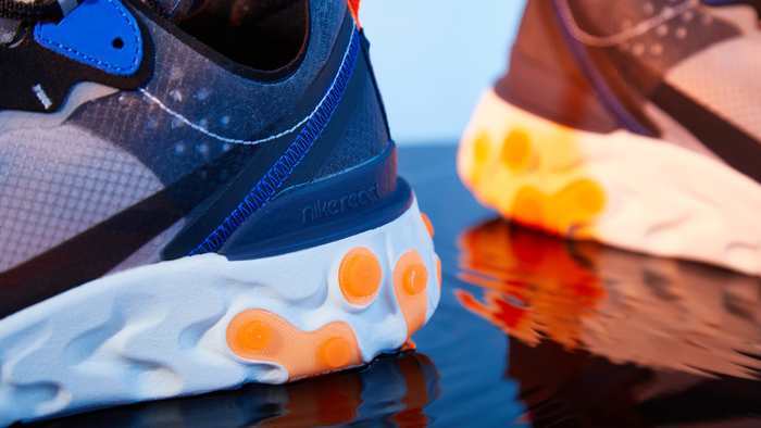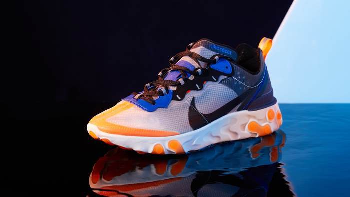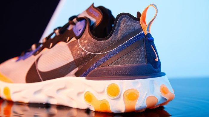 Nike React Element 87借鉴Nike Internationalist等传统跑鞋的线条设计,添加反光图案和透明细节,并运用Nike React技术,打造出一款创新型日常休闲鞋款。全新荷兰橙/黑/闪电蓝色版本货号AQ1090-004,预计10月11日上市。