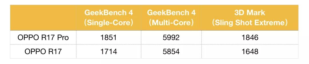 曲面玻璃和月牙湾设计回归,带来手感与质感的双重影响如果你已经试玩过 OPPO R17,那么第一眼看到 R17 Pro 时并不会在第一时间察觉有什么特别大的区别。6.4 英寸的水滴屏,隐藏式听筒,屏下红外传感,尽可能窄的边框和小下巴,以及屏幕上覆盖的第六代康宁大猩猩玻璃,这些都是两款 R17 共有的设计,有不少还是从 Find X 下放而来的。单看正脸的话,除了那个可能要预留天线净空的短下巴外,R17 与 R17 Pro 都已经做得足够好,至少比很多粗边框宽刘海的国产手机要顺眼得多。本次我们体验的 R17 Pro 为凝光绿,配色略显低调内敛;不过 R17 Pro 还有一款更吸眼球的「雾光渐变色」,它采用的电镀工艺实现了一半紫一半蓝的撞色设计,非常独特,与之前只有透过光照才能看到渐变效果的手机也有所不同。不过 R17 Pro 最大的变化还是在中框和背面,比如热弯玻璃带来的双曲线设计,以及机身顶部和底部的「月牙湾」凹槽,它们都曾在过往 R 系列手机中出现过。对比之下, 之前的 R17 则更接近于 iPhone 这类直板机。双曲面设计的好处我曾在评价 OPPO Find X 时提及过,它不仅能让机身的背部进一步贴合手掌,也使得过渡到左右两侧的中框更薄,这样持机时便会有一种轻薄的「错觉」,而非「厚重」。所以,哪怕是从数值上看,R17 Pro 的机身厚度和重量与 R17 十分接近 ,但实际上手后的手感差异还是很明显的。曲面设计会让机身显得更薄,你的手指也能更多接触到温润的玻璃表面。至于月牙湾,按照 OPPO 去年在 R11s 上的解释,这项设计其实是为了单手持机体验而生的:「月牙湾则可以将数据接口、扬声器凹进去,这样不管是横屏还是竖屏,手指就不需要再和各种孔位相互摩擦,接触的就是经过打磨的金属边框了。」另外,R17 Pro 上的 SIM 卡槽也有一点小变化,它并没有像 R17 一样放在机身右侧,而是藏在底部月牙湾内,而且还是正反双面设计。这种设计在 OPPO Find X 以及国行 iPhone XS Max 上都能看到,目的是为了节省机身内部的空间。不过 3.5mm 耳机爱好者可能会喜欢 R17 多一点,因为 R17 Pro 上已经看不到这个接口了。800 元的差价,都花在了哪些地方?除了外观设计上的差异,两者在配置上也有诸多细节上的不同。同样是 8G+128G 版本,R17 与 R17 Pro 的差价达到了 800 元,多花的钱我们买到了什么?首先是处理器的差异,R17 使用的是高通骁龙 670,而 R17 Pro 使用的则是高通骁龙 710,虽说都是 10nm 工艺,但主频还是有细微的差别,670 算是 710 的「降频版」,所以 Geekbench 4 上会有一百多分的差距,至于 GPU 型号就完全不一样了。从 3D Mrak 跑分数据来看,R17 Pro 的 GPU 更接近于骁龙 820 和 821 的水准。具体到游戏体验方面,我在 R17 Por 手机上试玩了几次《绝地求生:刺激战场》游戏。从 GameBench 的监测数据来看,一局 20 多分钟的吃鸡游戏,R17 Pro 可以在高帧率模式下保持 30 帧稳定运行,发热的区域主要集中在机身顶部。不过习惯了各种旗舰机的热度后,这种「温热」算是小意思了。所以还是那句,只要不是非常看重手机游戏,也不在乎那一两秒的应用启动差距,骁龙 6 系、 7 系芯片并不会比 8 系差太多。当然,要是你追求 60 帧的顶级游戏体验,搭载了骁龙 845 芯片的手机还是能轻松甩开 670、710 一大段距离的。摄像头是 R17 Pro 与 R17 最大的不同之处。配置上看,R17 Pro 前置和 R17 一样,都是 2500 万像素;后置区别就比较大了,R17 Pro 采用了 1200 万主摄+2000 万副摄组合,并为主摄加入了类似三星 Galaxy S9+ 的可变光圈设计,可以根据光照环境自动在  f/1.5 和 f/2.4 两档光圈值中切换,并且支持 OIS 光学防抖。还有一颗是 TOF 立体摄像头,主要用于 3D 建模、AR 应用和体感游戏等。在 R17 Pro 的拍照应用里你也能看到专门的 3D 拍照模式,但日常拍照则和这颗 TOF 摄像头没什么关系。另外一点差异则是电池部分,R17 电池为 3500 毫安,而 R17 Pro 为了支持 Super VOOC 闪充,采用了 2 颗 1850 毫安的双电芯设计,总计为 3700 毫安,不仅续航更好,关键是充电真的非常非常快。从实测来看,如果你使用配套的 Super VOOC 充电头和数据线,将 R17 Pro 从 50% 电量充到 100% 只需要 20 分钟,对比之下 R17 则需要将近 1 个小时。所以,哪怕是你突然要出门却发现手机快没电了,R17 Pro 也可以在很短的时间里对电量进行补充,满足至少大半天的使用需求。最后一个细节是 NFC。R17 Pro 是支持 NFC 刷地铁公交的,而 R17 则依旧不支持;另外两者都用的是 USB Type-C 接口,但 R17 Pro 支持 USB 3.1 传输,而 R17 仅为 USB 2.0 速度。有了手持夜景模式,晚上拍照片不用再担心一片糊了使用 OPPO R17 Pro 拍照是一件很舒服的事情,它的对焦体验并不输于主流旗舰,自动模式下的操控也和 iPhone 基本一致。借助 AI 场景识别,R17 Pro 会给出不同的测光,你也能够在拍照界面实时看到蓝天、微距和人像等这类识别出来的场景名称。但最吸引人的是 R17 Pro 内置的「夜景模式」,这也是我最喜欢的功能。它有点类似之前华为 P20 Pro 的超级夜景,即通过约 4-5 秒的连续采样,拍摄多张不同曝光值的照片,再借助算法进行多帧合成,最终输出一张更高动态范围,且能够保留更多画面细节的照片。实话是,这个功能在晚上以及昏暗室内情况下确实很好用,就算是不懂拍照的小白用户在大晚上随手一拍,样张里的霓虹灯广告牌或高楼也不会出现过曝或是明暗不均的情况,配合光学防抖还能保证足够高的成片率,而且完全是手持拍摄。只不过在