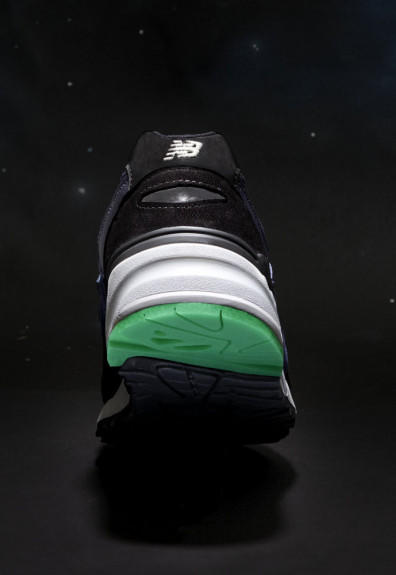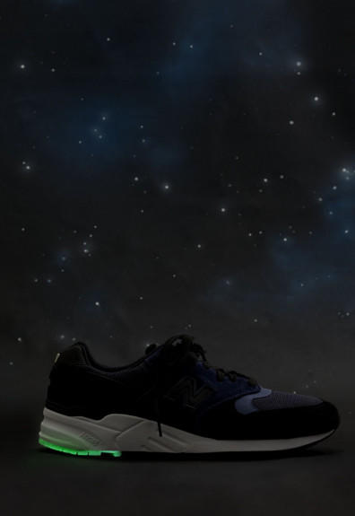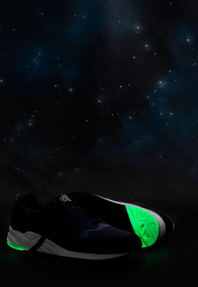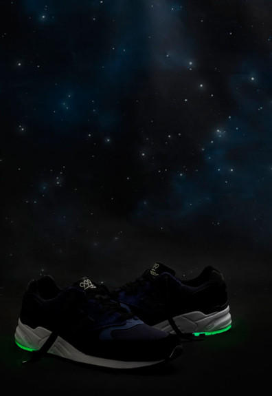 鞋款以黑/蓝/灰三色为主轴打造鞋面,象征了漫漫长夜;而鞋底后跟的夜光元素,则代表了黑夜中的星云。