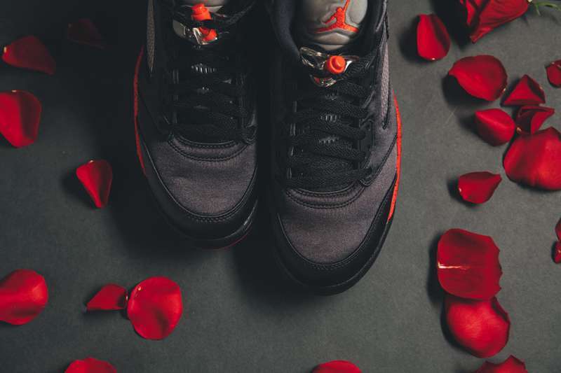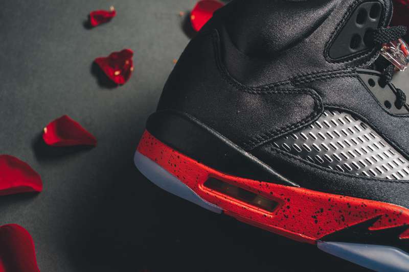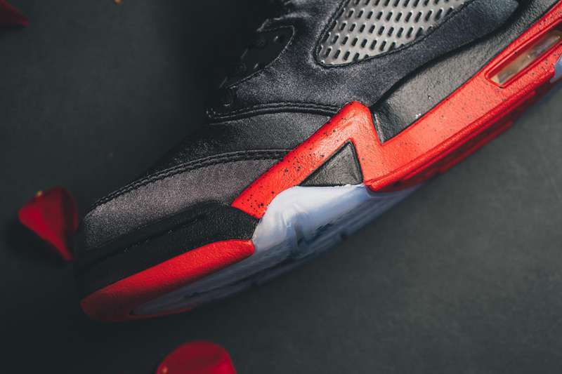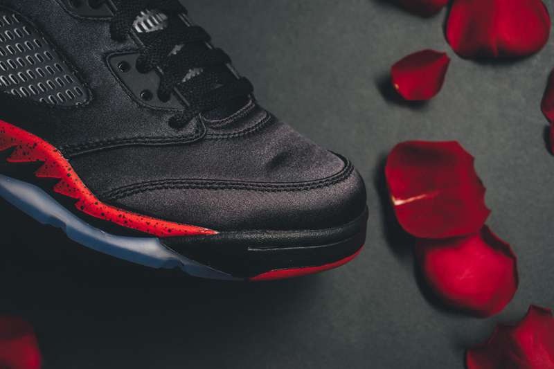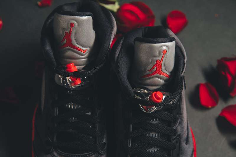 近年来 Jordan Brand 先后推出了不少丝绸版球鞋,独特质感每每亮相都会成为鞋迷关注的焦点并引发热议,即将于下周登场的 Air Jordan 5 丝绸版于今日曝光了上脚美图。此次丝绸版 Air Jordan 5 采用了经典黑红配色方案,以黑色为主调的鞋身配合丝绸所带来的独特视觉感受,奢华感十足,中底及鞋舌 Jumpman Logo 点缀抢眼大红,经典搭配之余不失吸睛亮点。