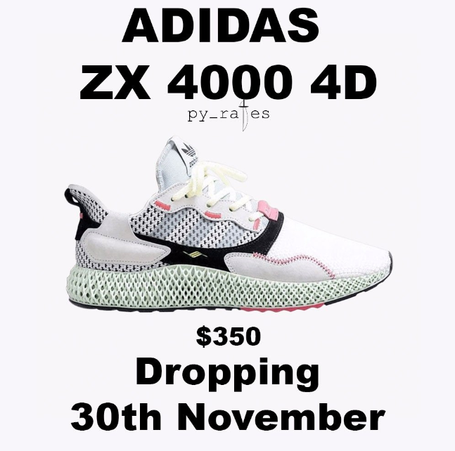 今年下半年,多款 4D 跑鞋迎来市售,除了已经发售的多款联名版本和 Never Made 系列的 4D 版 I-5923,还有一款早已亮相的 ZX 4000 4D 近日曝光了发售计划。曝料账号 py_rates 称这款鞋将于 11 月 30 日正式发售。