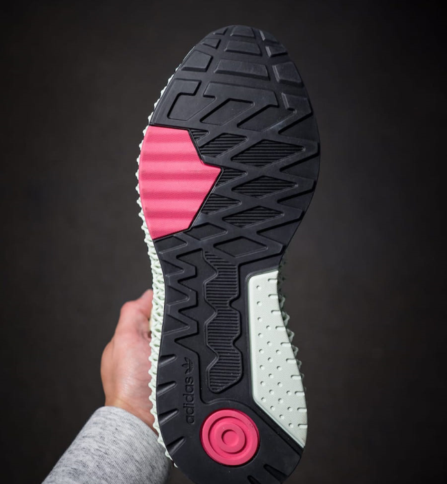 光看鞋名就可以看出,鞋面以经典跑鞋 ZX 4000 为蓝本打造。为了带来更好的穿着脚感并适应 4D 的前卫风格,鞋面将材质改为 Primeknit 编织,并加入皮革拼接补强,造型颇具解构风格。