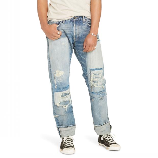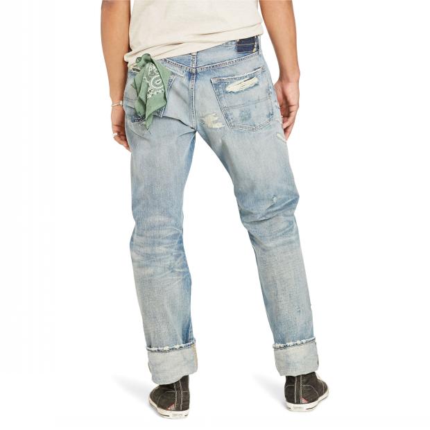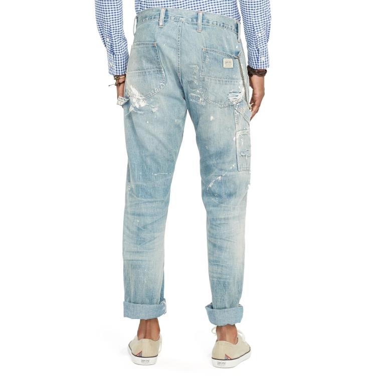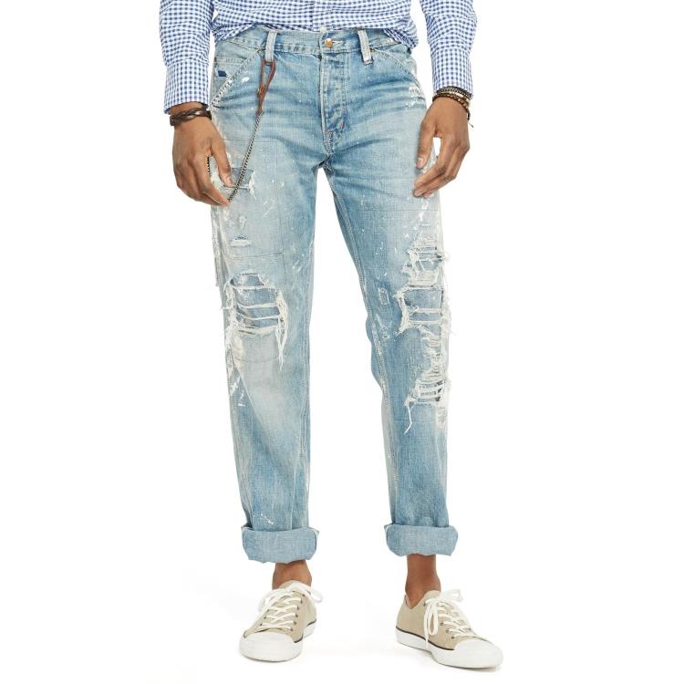 Ralph Lauren品牌旗下的Denim & Supply是来自布鲁克林艺术社区的牛仔系列品牌,该品牌的设计充满了粗狂不羁的个性,充满着复古怀旧的风情。浅蓝色水洗布料,修身直筒裤型,注入漆点与撕裂效果。呈现绝佳美感。