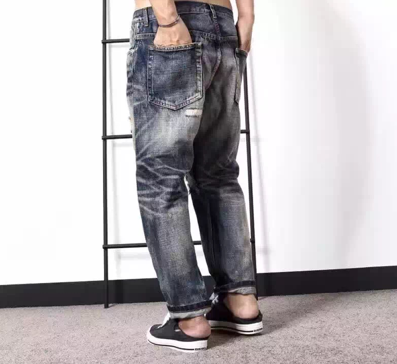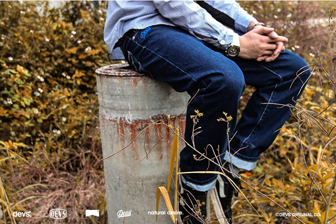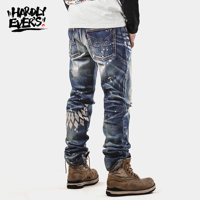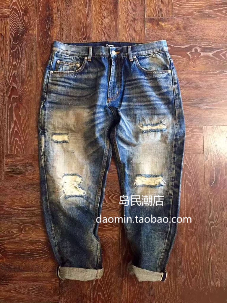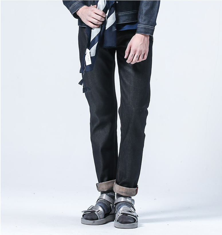 采用美产赤耳丹宁布料,直筒裤型,手工破坏工艺与补丁结合。粗犷而洒脱,极具美式风情。
