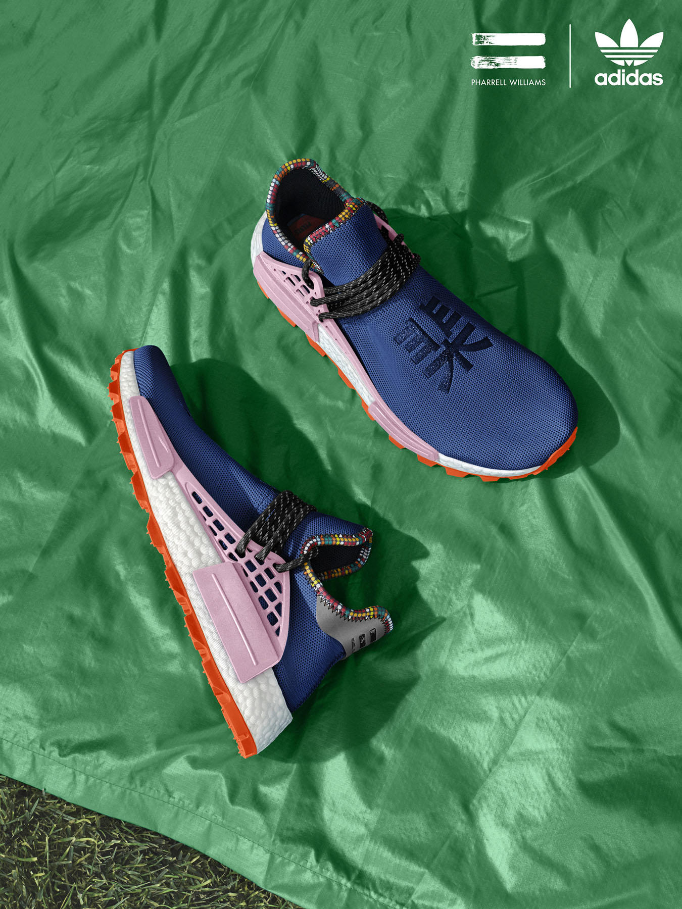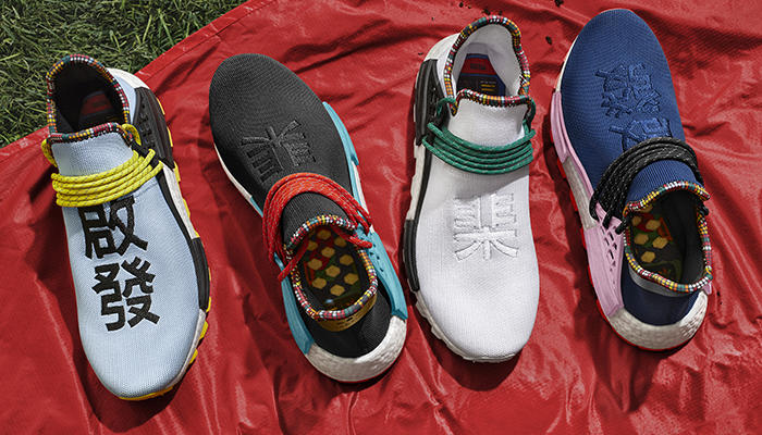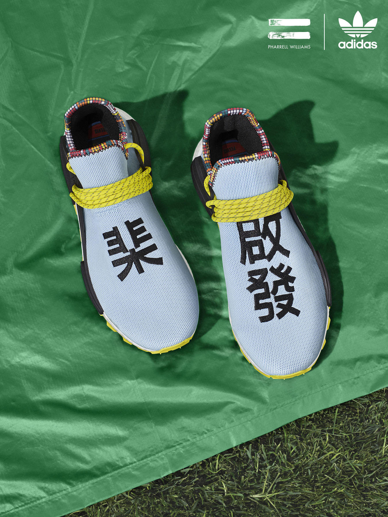 该系列依旧采用标志性 Hu NMD 鞋款为蓝本,五款配色分别以黑、白、蓝紫、浅蓝和墨绿色为主调,并在鞋带、侧身支架与后跟部分融入撞色细节,而衬里中则采用了颇具民族风格的花纹样式,多款颜色碰撞出 Pharrell名族风格的多彩鞋领。鞋面上的「啟發」和「棐」字样则是新系列的主题所在,巧思细节体现浓郁异国风情。