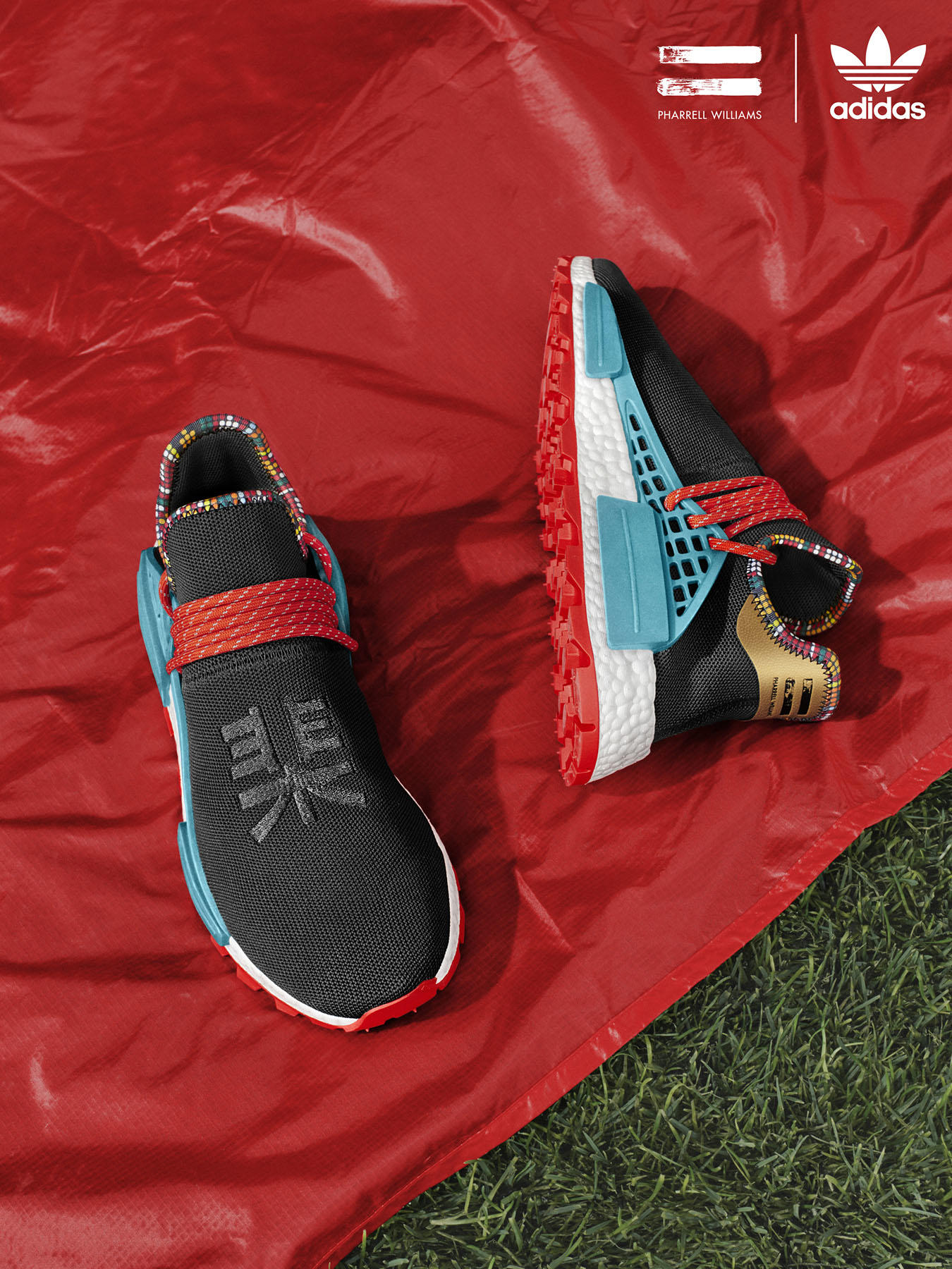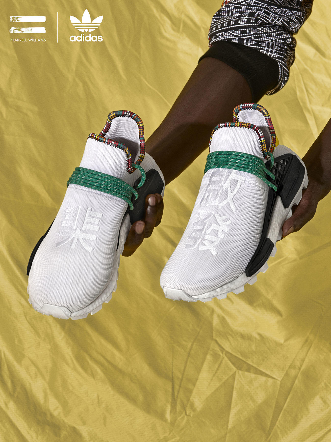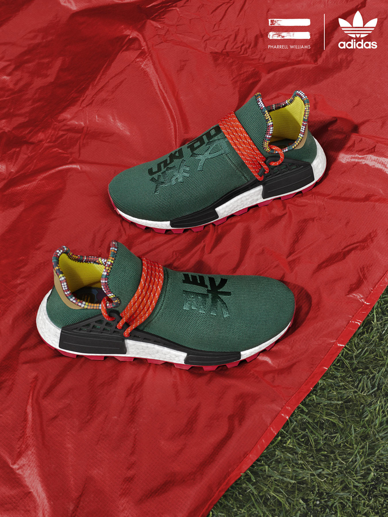 该系列依旧采用标志性 Hu NMD 鞋款为蓝本,五款配色分别以黑、白、蓝紫、浅蓝和墨绿色为主调,并在鞋带、侧身支架与后跟部分融入撞色细节,而衬里中则采用了颇具民族风格的花纹样式,多款颜色碰撞出 Pharrell名族风格的多彩鞋领。鞋面上的「啟發」和「棐」字样则是新系列的主题所在,巧思细节体现浓郁异国风情。