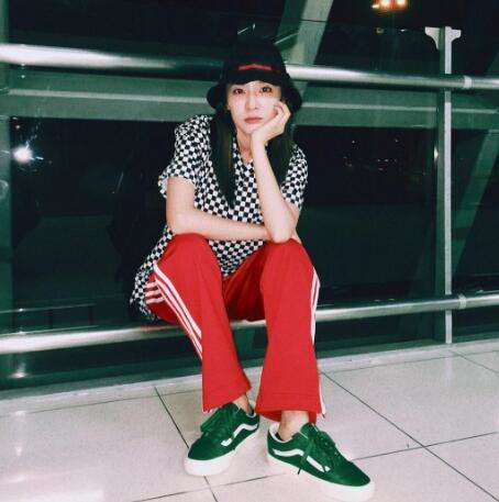 有女版G-D的Sandara Park,绿vans old school+红校裤,简直不要太亮眼