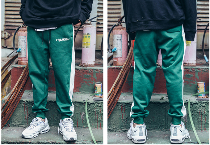 宽松的款式,想在里面穿多厚的绒裤都没问题~白色条纹侧边和17年即将流行的绿色搭配,在沉闷的冬天让人眼前一亮,这种男女通吃的裤子不妨带着你的妹子一起穿哦。