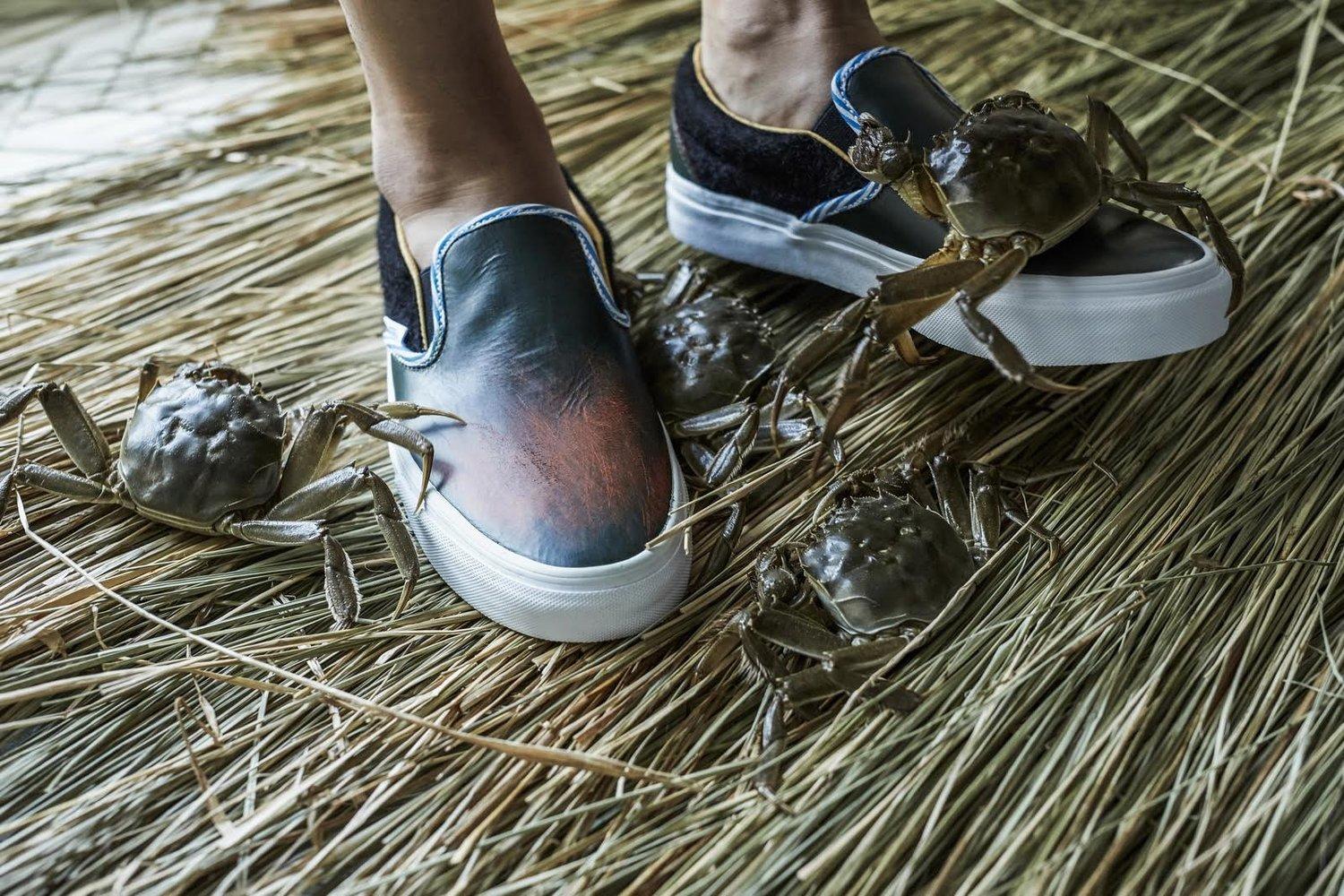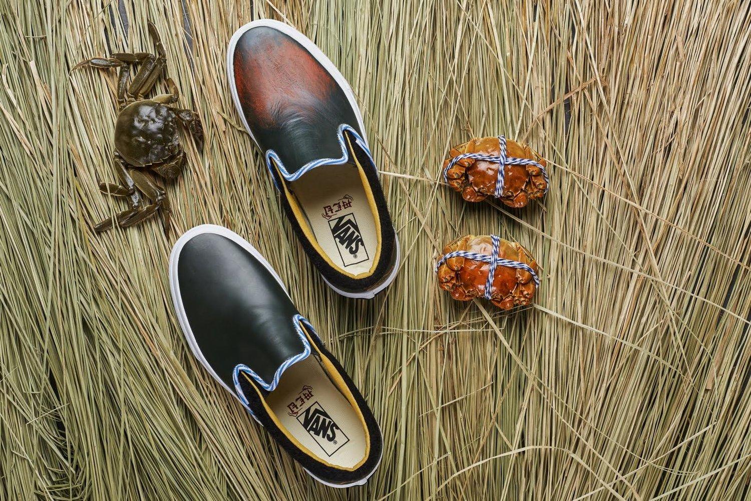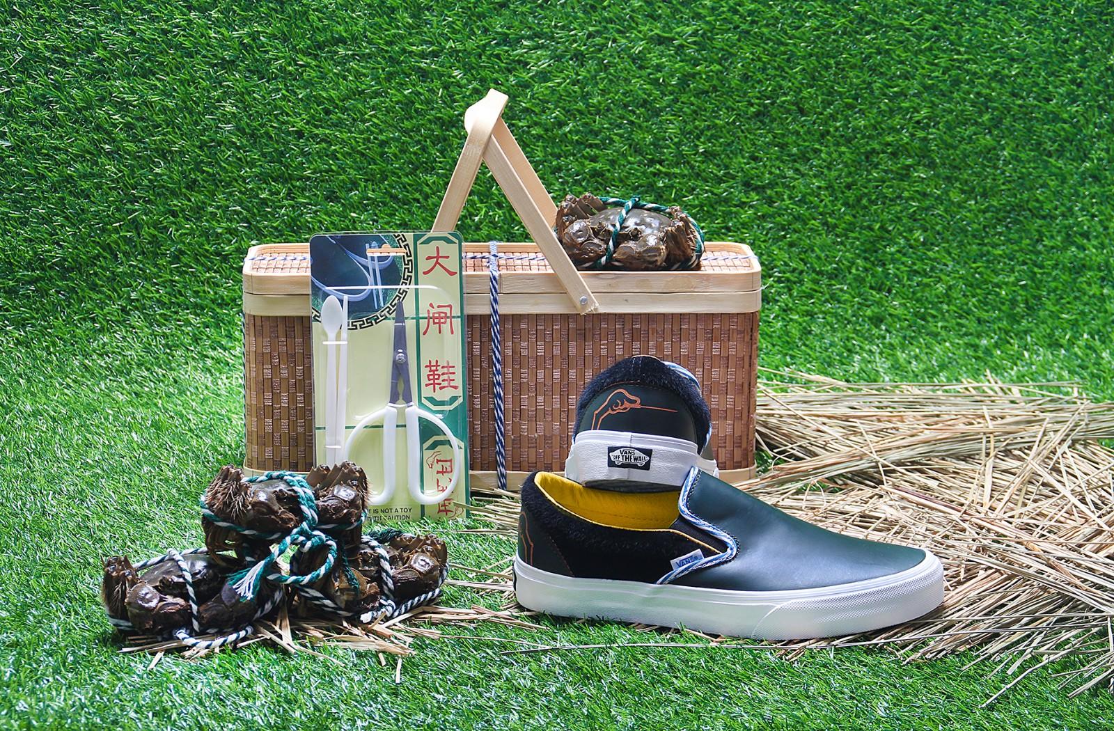 ACU x Vans Slip-On以上海人喜欢的大闸蟹作为主题,重新定义经典的Slip-On。首先鞋面的颜色采用与大闸蟹相近的深绿色,并用绑大闸蟹的蓝白相间绳子作为鞋口包边,这样的设计可以说非常传神。