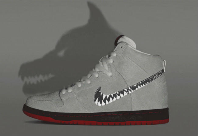 Nike SB Dunk High x Black Sheep以披着羊皮的狼作为创作灵感,鞋身以灰色麂皮为主题,搭配黑红的中外底,这颇有一众鞋身似“羊皮”、中外底似“狼”的感觉。而白色的鞋带、鞋舌以及侧面SWOOSH都起到一种点睛之笔的作用。