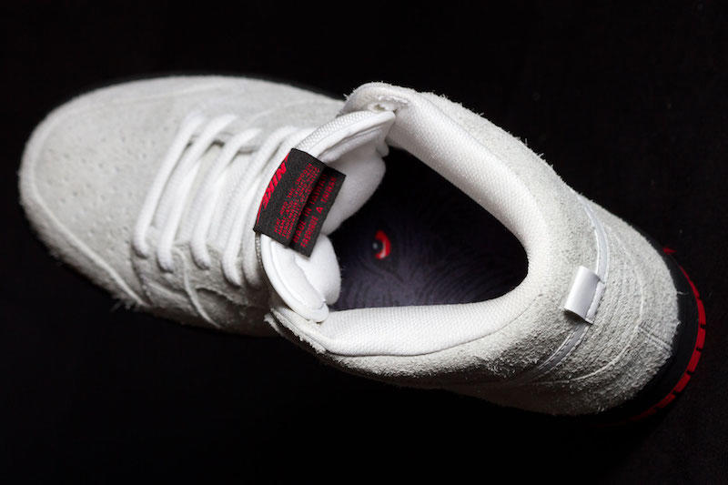 当你将鞋放置在平地,俯视这双Nike SB Dunk High x Black Sheep,你就会发现鞋垫处就有一只狼的左右眼在注视着你,因此这双联名还是有点意思的呀!