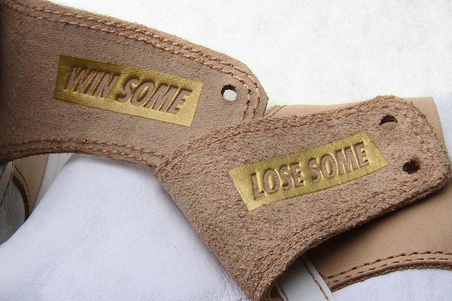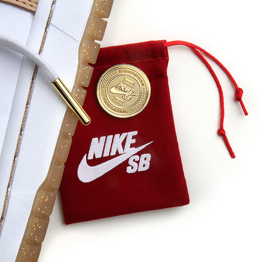 今年8月份NIKE与密歇根滑板店Premier就以刮刮乐为灵感,联手设计出一双全新的SB DUNK High。整双鞋使用真皮作为鞋面彩材料,白色与金色的皮革相呼应,显得十分有质感。而在侧翼鞋带孔以及鞋垫处,还印有“Win Some”、“Lose Some”以及“In Odd We Trust”这些充满赌博类型的主题字样!