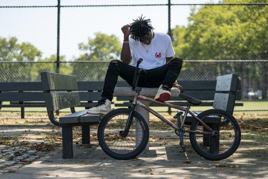 对于Nigel Sylvester起初小编也不太了解,只知道他是一个美国玩BMX(自行车越野)玩得很溜的一个人,认识他是因为之前发售的Nigel Sylvester x Nike SB DUNK High “S.O.M.P”,至此已经过去4年了。Nigel Sylvester出名并不止是一个BMX车手,他的个人Vlog《GO》系列同样在美国十分火热。而且在他的Vlog中,Air Jordan 1可谓是出现频率最高的一款鞋,因此他与Air Jordan 1的联名也就理所当然了。