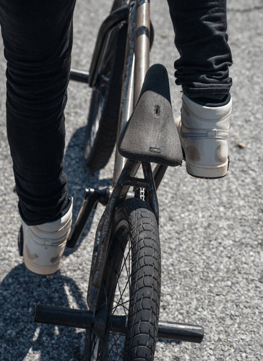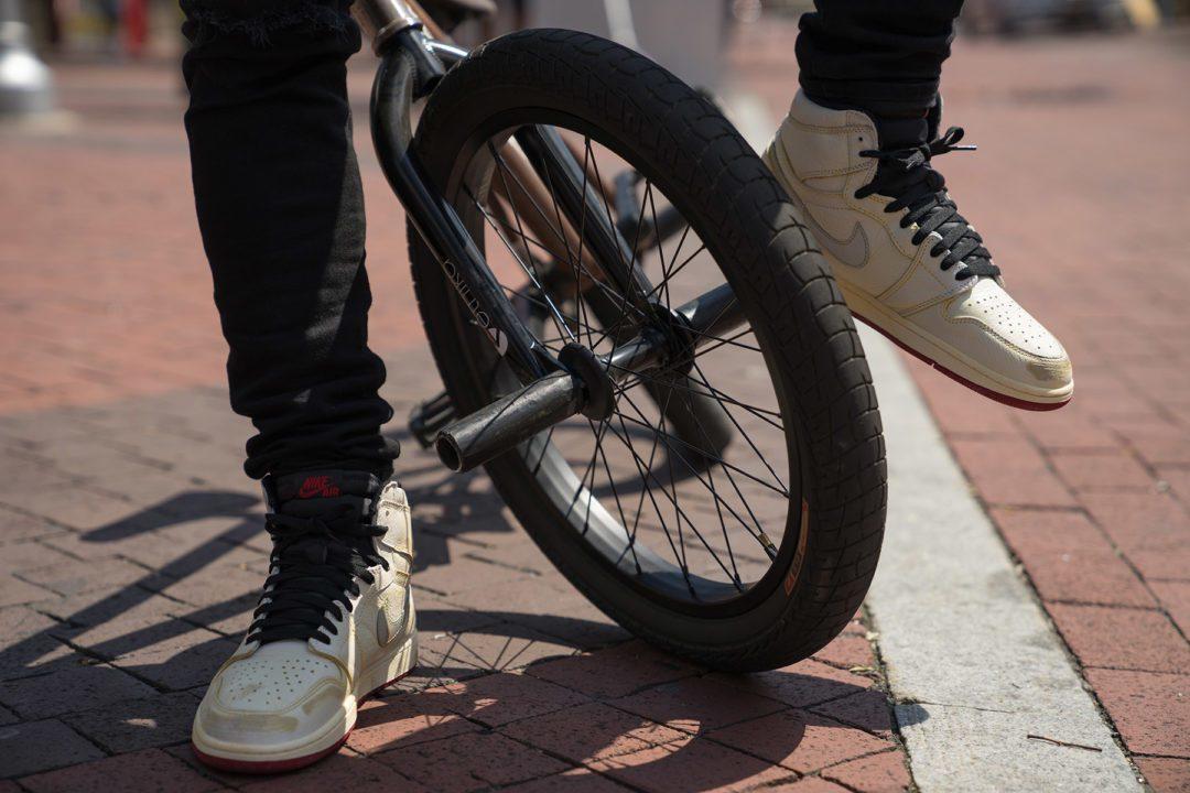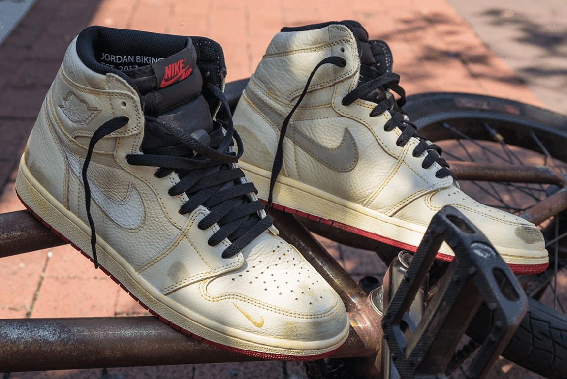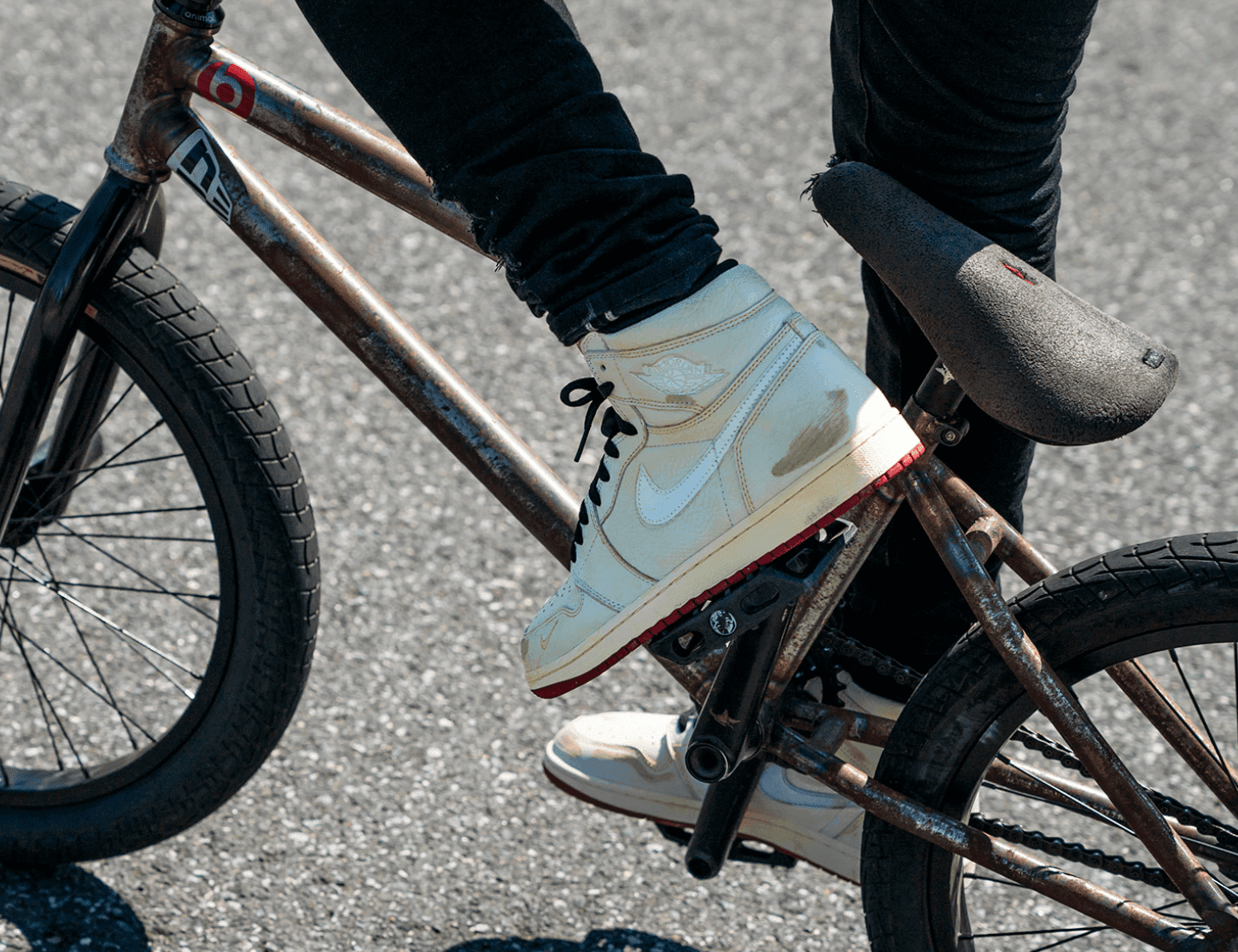 据Nigel Sylvester所说,这双鞋的设计源于他之前一直穿的Air Jordan 1“Shadow”,大家也会发现右脚的做旧细节远比左脚来得多。因为有一段时间Nigel Sylvester经常穿着Air Jordan 1“Shadow”骑车,它发现由于BMX没有刹车,左脚用于发力,而右脚就理所当然用于刹车了。因此在设计时,右脚后跟处会有更加多的磨损痕迹,因为这个位置离车轮最近。