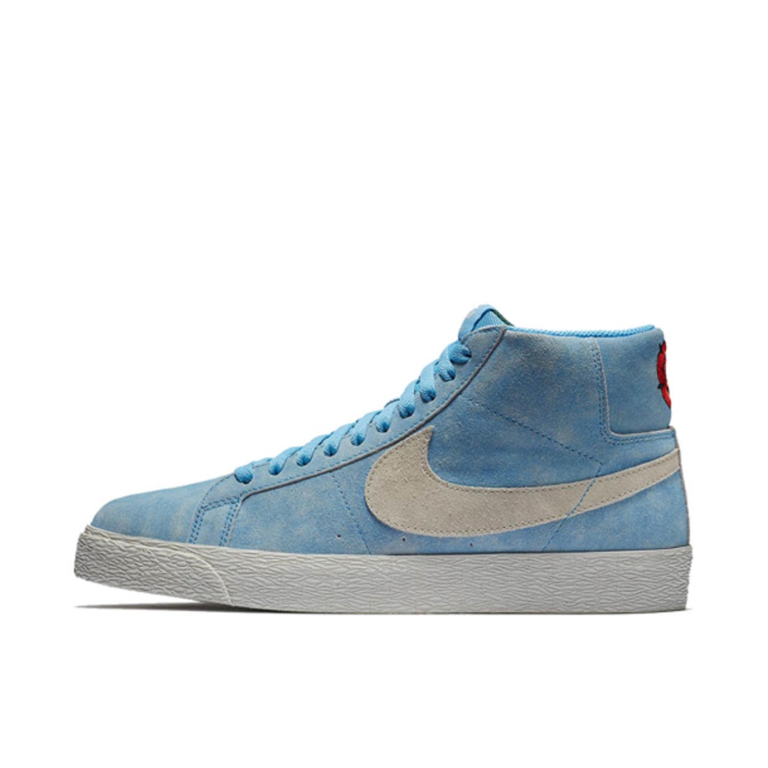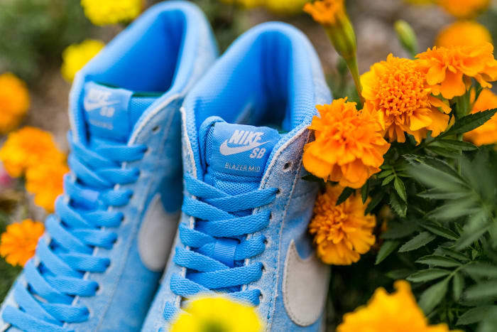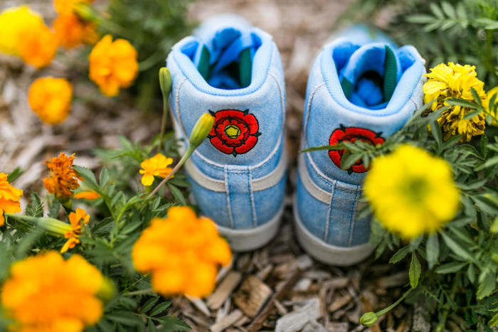 Lance Mountain x Nike SB Zoom Blazer Mid整鞋以水洗牛仔蓝作为鞋面的主色调,辅以深蓝色的鞋带,侧面的白色Swoosh,看起来非常小清新。这种水洗牛仔蓝看上去就像一双旧鞋,非常有质感,就像是牛仔裤洗多的感觉。而鞋后跟更是加入一朵花卉的刺绣图案作为点缀,显得小清新之余还有那么一丝少女心。
