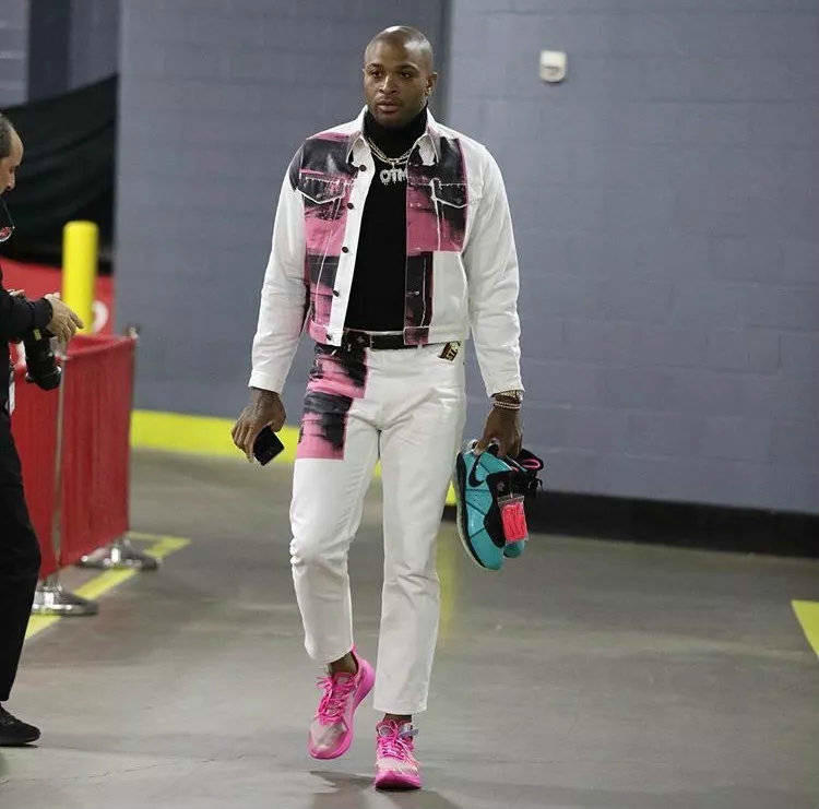 P.J.-塔克上脚OFF-WHITE x Nike Zoom Fly SP“Tulip Pink” ,手拿Nike LeBron 8“South Beach”