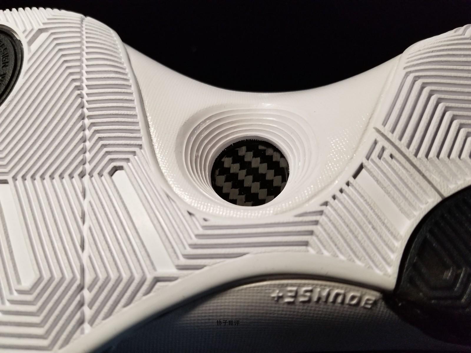 配置方面,鞋面采用塑料热熔材质,而且在鞋身中部嵌入碳纤维织物后跟tpu稳定片,中底采用的是FOAMEVALITE发泡材料,之前偷偷试穿过一次,感觉挺硬的,不知道实战感受会不会好一些?大底采用的依旧是人字纹大底纹路,难道人字纹大底纹路已经成为这个价格区间球鞋的标配了嘛?纹路深,材质硬,抓地力有待考究大底上也有一块挺大的tpu,这双鞋子的抗扭曲应该挺出色的,对比以上超轻10跟轻势2,重量上超轻10是要比轻势2轻一些的!