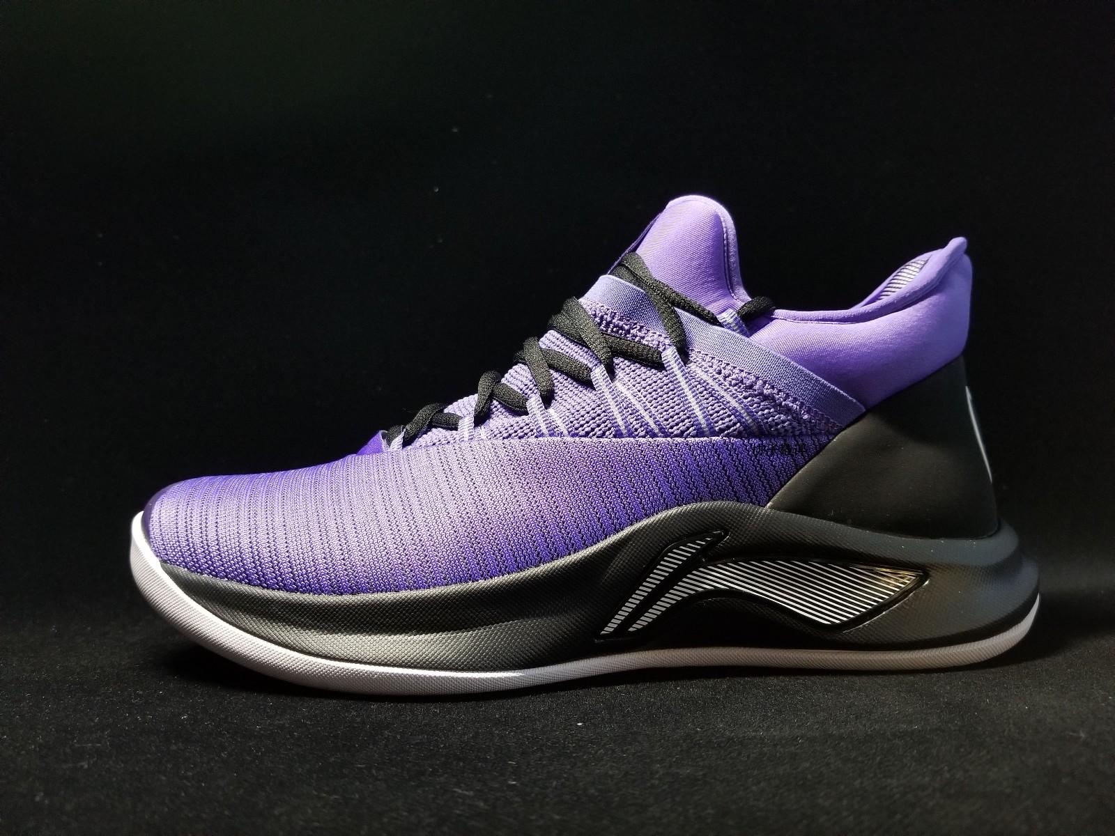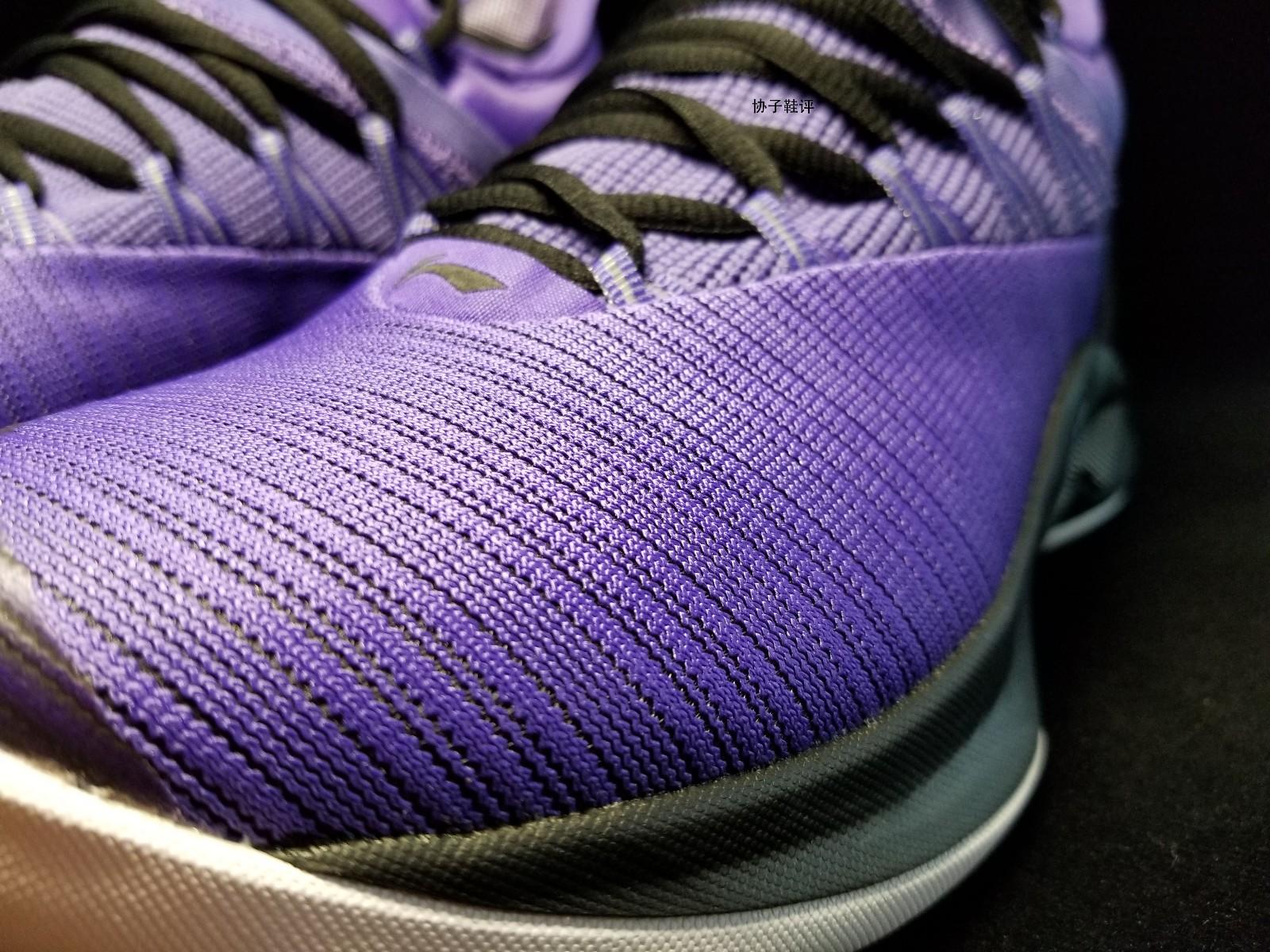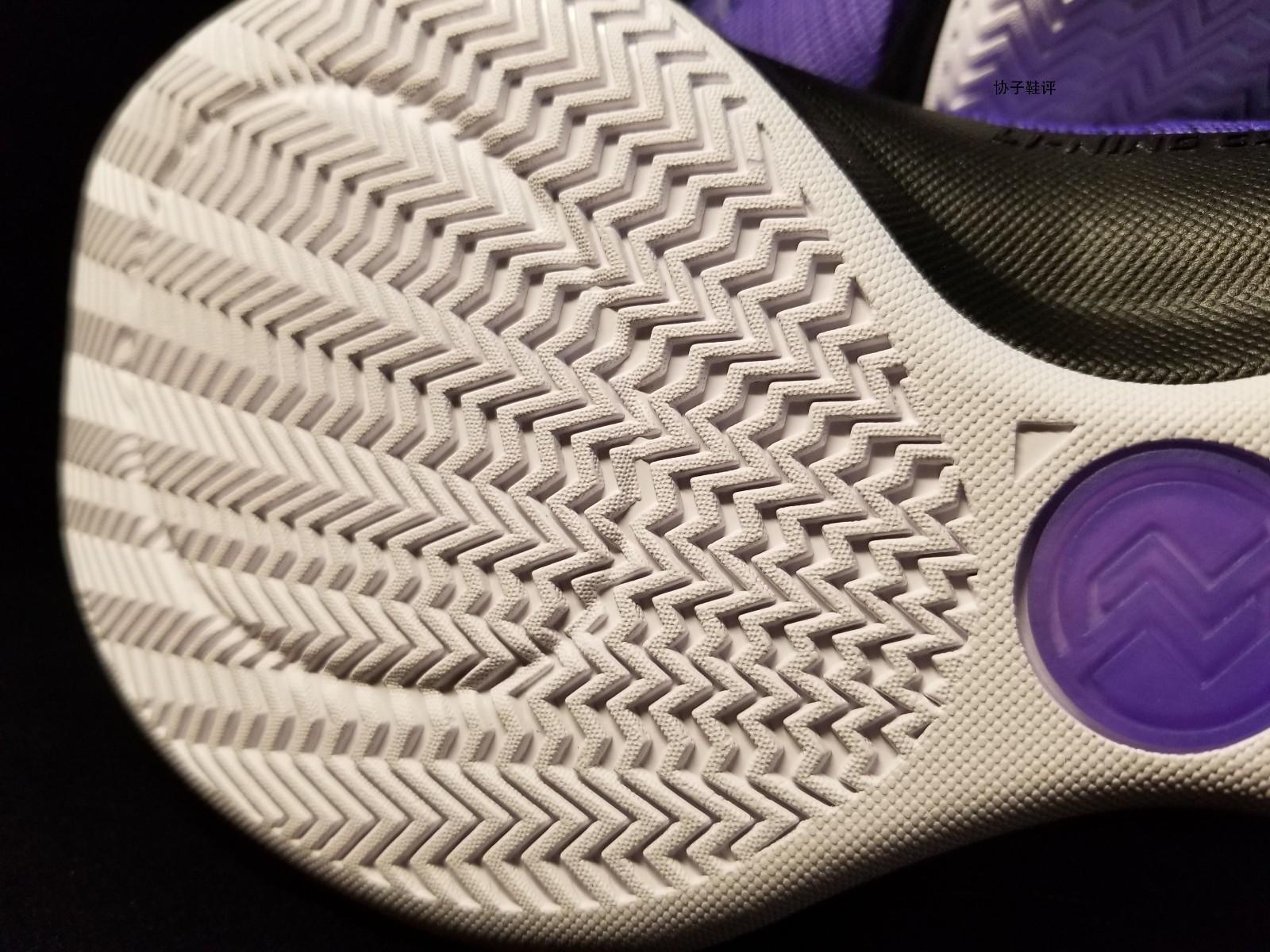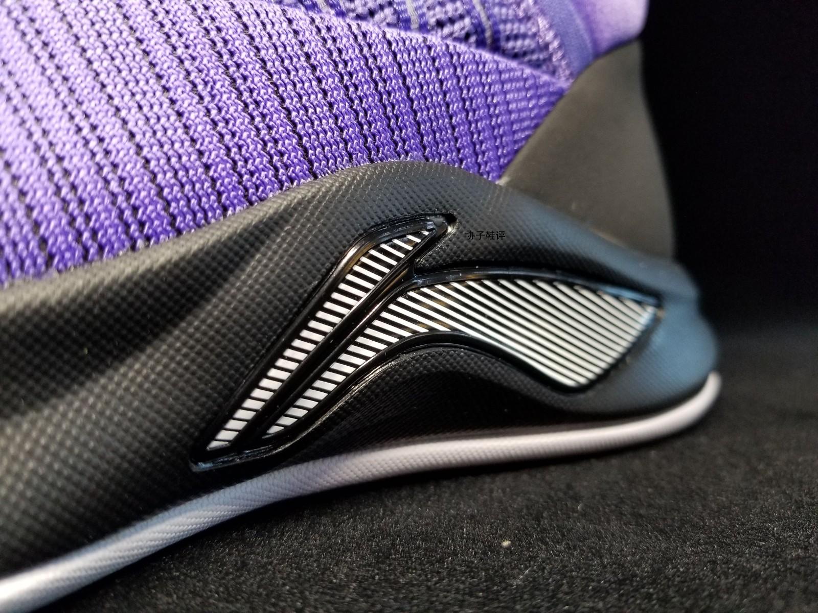 先看外观,鞋子采用大幅度的紫色搭配黑色为主色调,看起来是一个非常骚气的配色,是那种骚起来又不至于让人反感的配色细节也是有的,黑白相间的李宁logo后跟的闪击logo还有鞋舌部分的5个小箭头这配色以及鞋型反正都挺合我的胃口的,不知道你们的感受如何?(当然我也不会在乎你们的感受哈~)