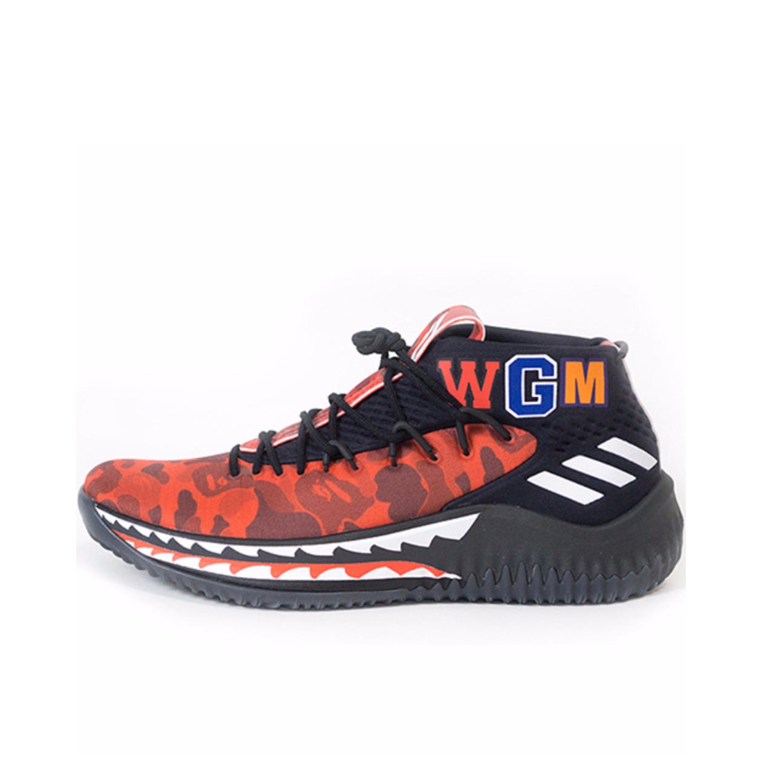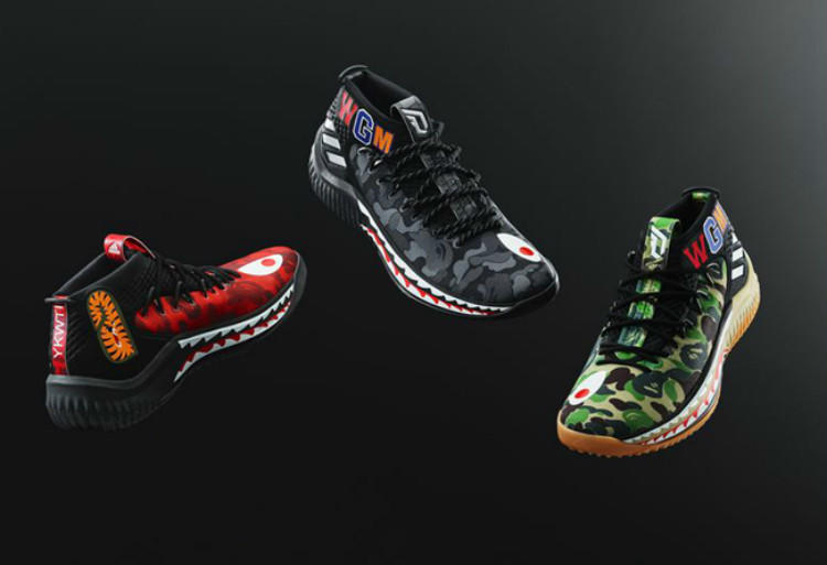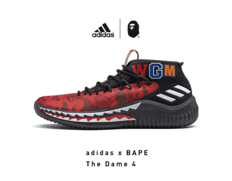 潮牌联名越来越多的将目光瞄准了实战鞋款,在2015年亚洲巡演赛期间给adidas旗下球星达米安-利拉德留下深刻印象的BAPE,此番携手adidas以其个人第四代签名鞋Dame 4为蓝本展开联名企划。有着“最骚实战鞋”美誉的BAPE x Dame 4在充分展现鞋身线条和轮廓优势的同时,又巧妙的融入了BAPE品牌猿人迷彩、鲨鱼锯齿装扮、WORLD GONE MAD缩写字体等经典元素。此次联名合作一共带来绿色、黑色和红色三个配色的BAPE x Dame 4,其中最为惊艳的红迷彩版本仅为Family & Friends亲友限定。