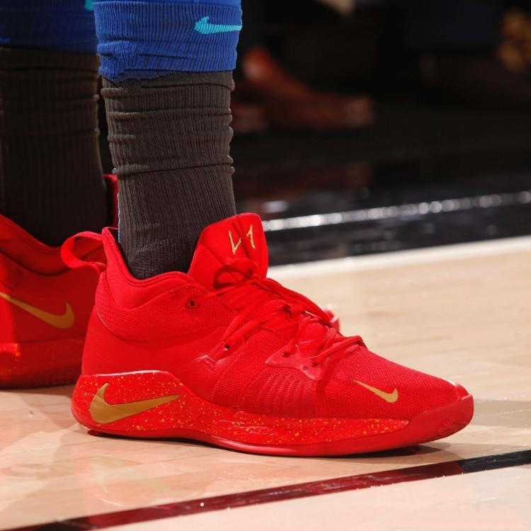 在比赛结束前0.6秒贡献极限压哨扳平三分“神仙球”的卢卡-东契奇上脚大红色Nike PG 2