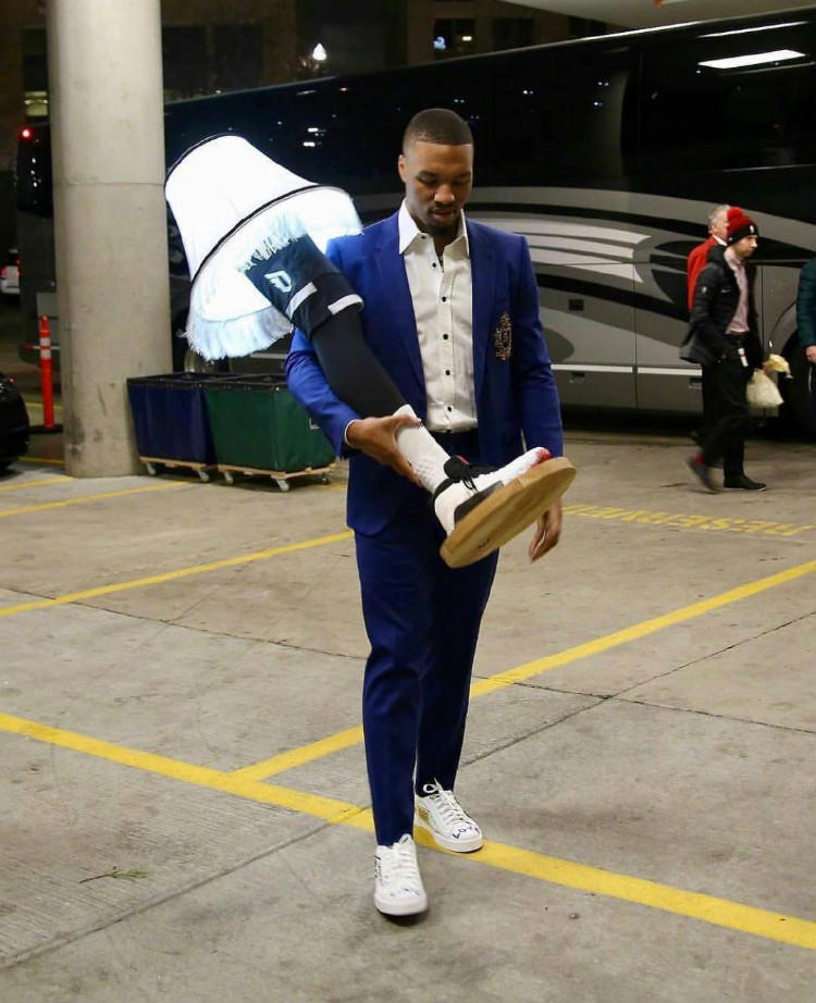 “抱大腿”,达米安-利拉德在圣诞大战之夜入场时抱着上脚adidas Dame 5的台灯