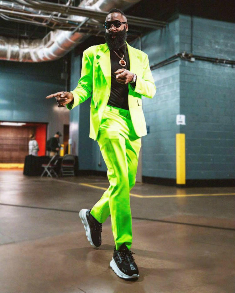 詹姆斯-哈登在赛前上脚说唱歌手2 Chainz与时装品牌Versace的联名鞋款