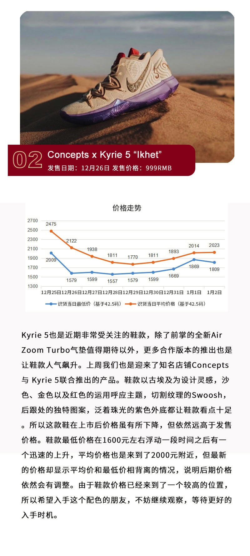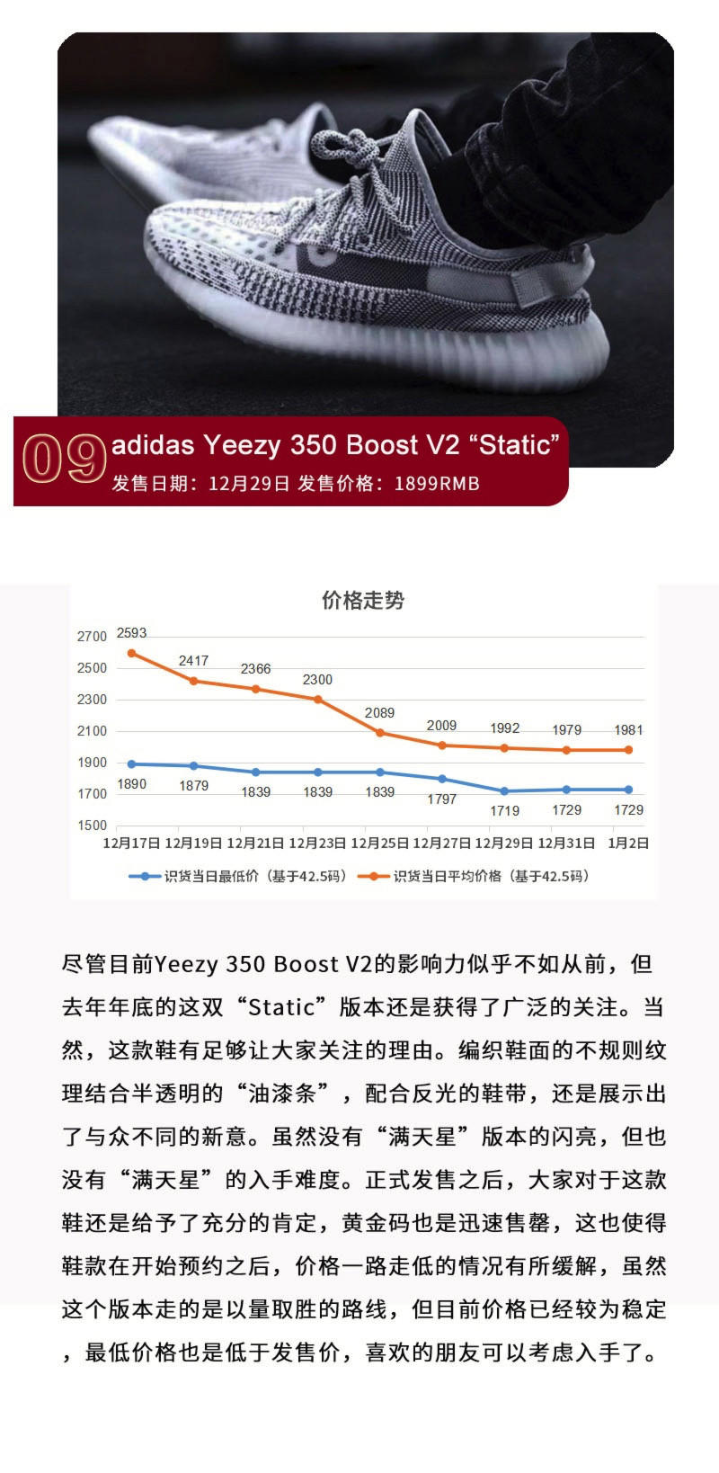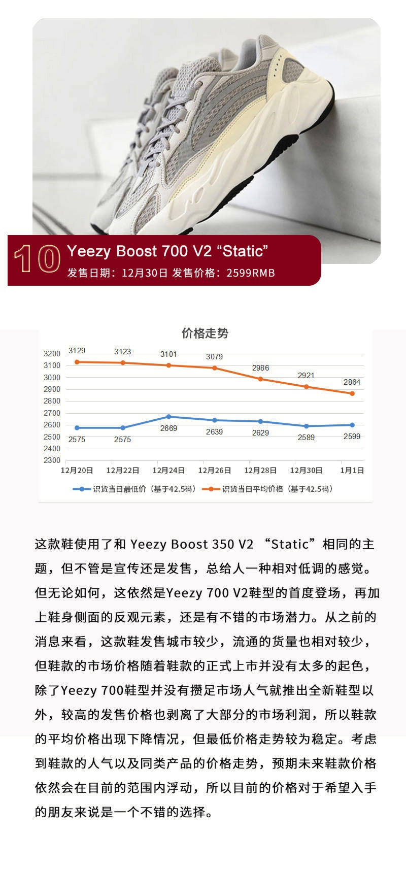 2019在大家的忙碌中又开始了,而所有为年份交替而准备的重磅鞋款也都全部登场。过去的一周,Yeezy系列进行了连续发售,带来了包括Yeezy 350 V2 和Yeezy 700 V2在内的“Static”配色产品。而Concepts x Kyrie 5 “Ikhet”由于“紫龙虾”聚集的人气以及鞋款本身的外观设计而备受关注,极具复古质感的FOG x Air Skylon 2黑白两色并没有得到市场的热捧,反倒是Jordan Brand “CNY” 新年系列因为Air Jordan 12的可撕鞋面而成功抢镜。不过相比之下,最受大家热议的,恐怕还要数很多鞋款的价格上涨,而具体情况如何,本期继续为大家呈现。