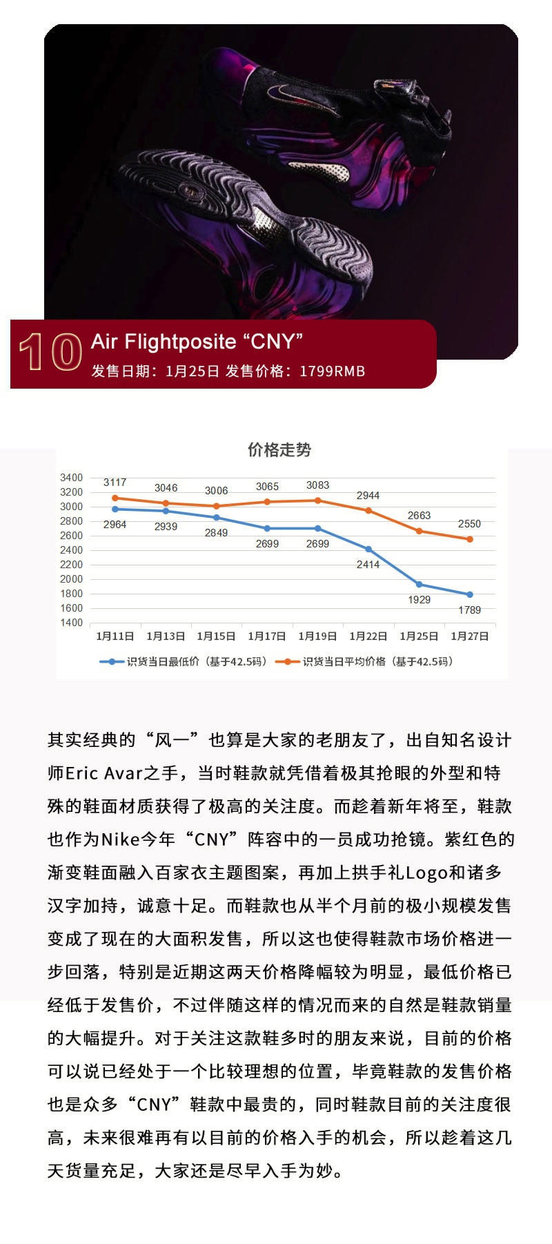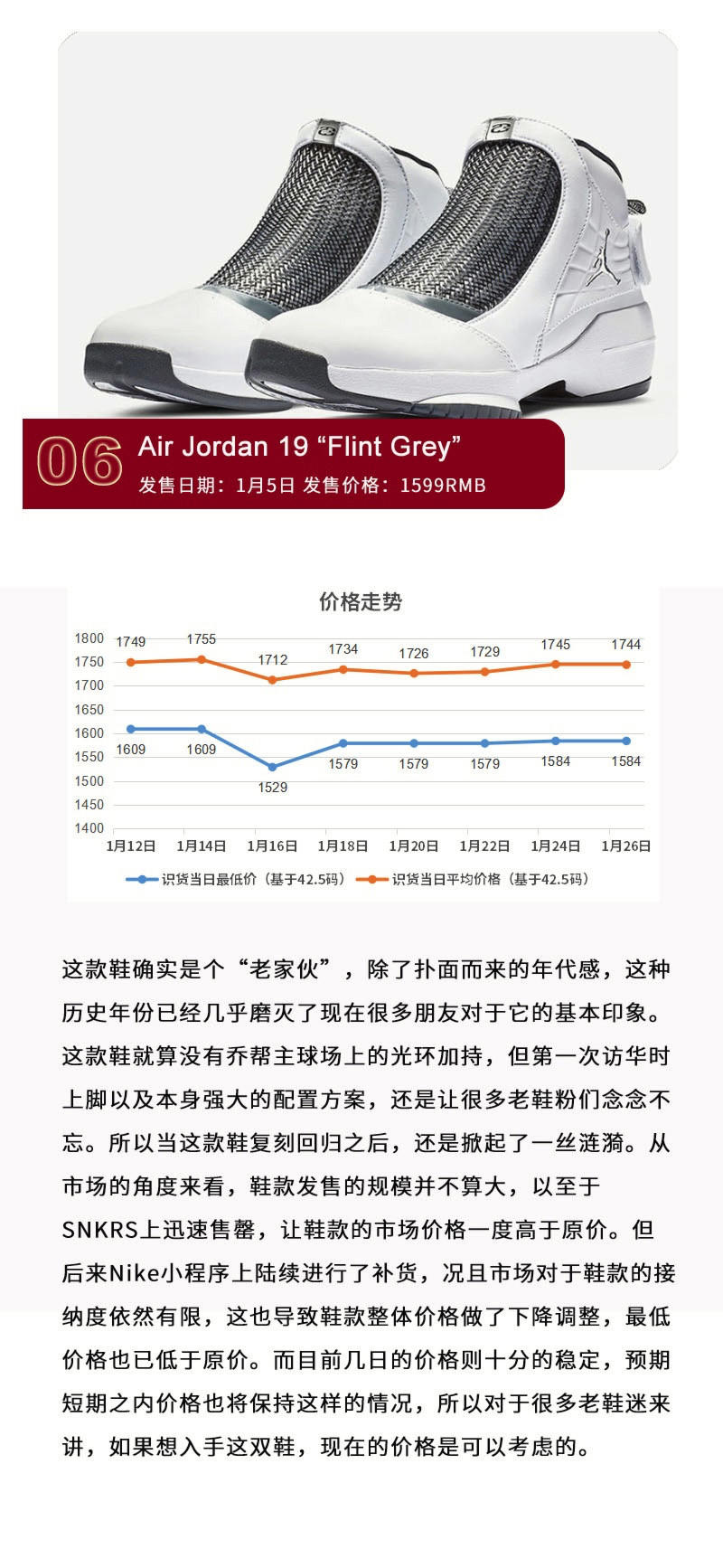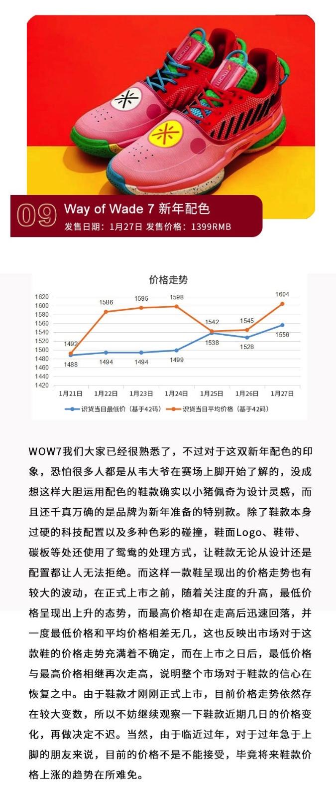 过去的一周又是忙碌的一周,快过年了,大家也在为这个春节做着各种各样的努力。同样,在过年进入倒计时的这段时间,各个品牌也是继续拿出自己的诚意之作。号称年底终极BOSS的Nike Air Flightposite CNY迎来了大规模发售,Air Jordan 1 “Neutral Grey”的发售开启了今年Air Jordan 1的序幕,源自迈克尔-乔丹母校兰尼高中配色的Air Jordan 5 JSP “Laney”与保罗-乔治全新首发NASA主题配色签名鞋Nike PG3在同一天发售,满足着不同人群的需求。而adidas再次与菲董联手推出的CNY系列,Solar Hu 与 BYW 两款鞋已同步上架。不过要论惊艳,绝对有韦德之道 7 推出的猪年配色,毕竟“小猪佩奇” 配色应时应景,大胆的撞色设计让人过目不忘。当然,让大家惦记的鞋款岂止这些,还有很多大家已经熟知的老朋友或者他们的新配色也呈现出境遇不同的价格走势,所以本期不妨带大家回顾一些这段时间大家关心的鞋款。