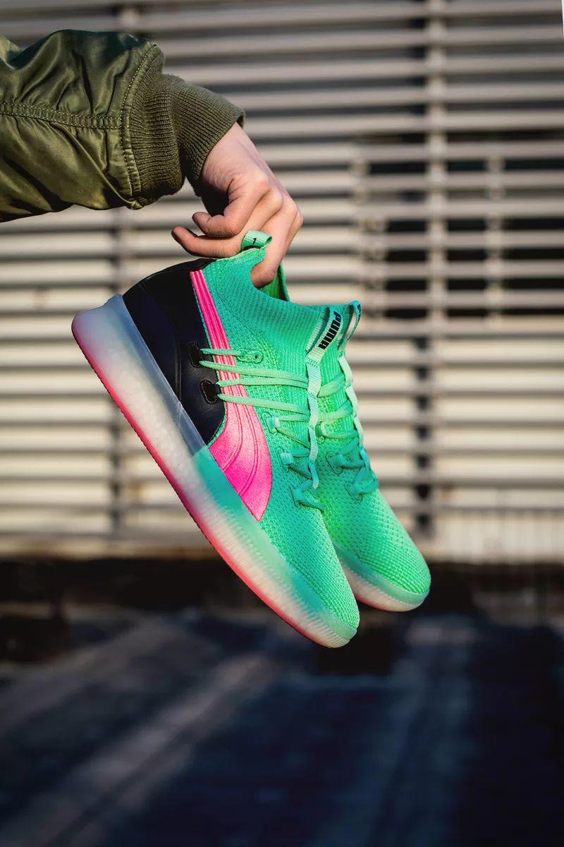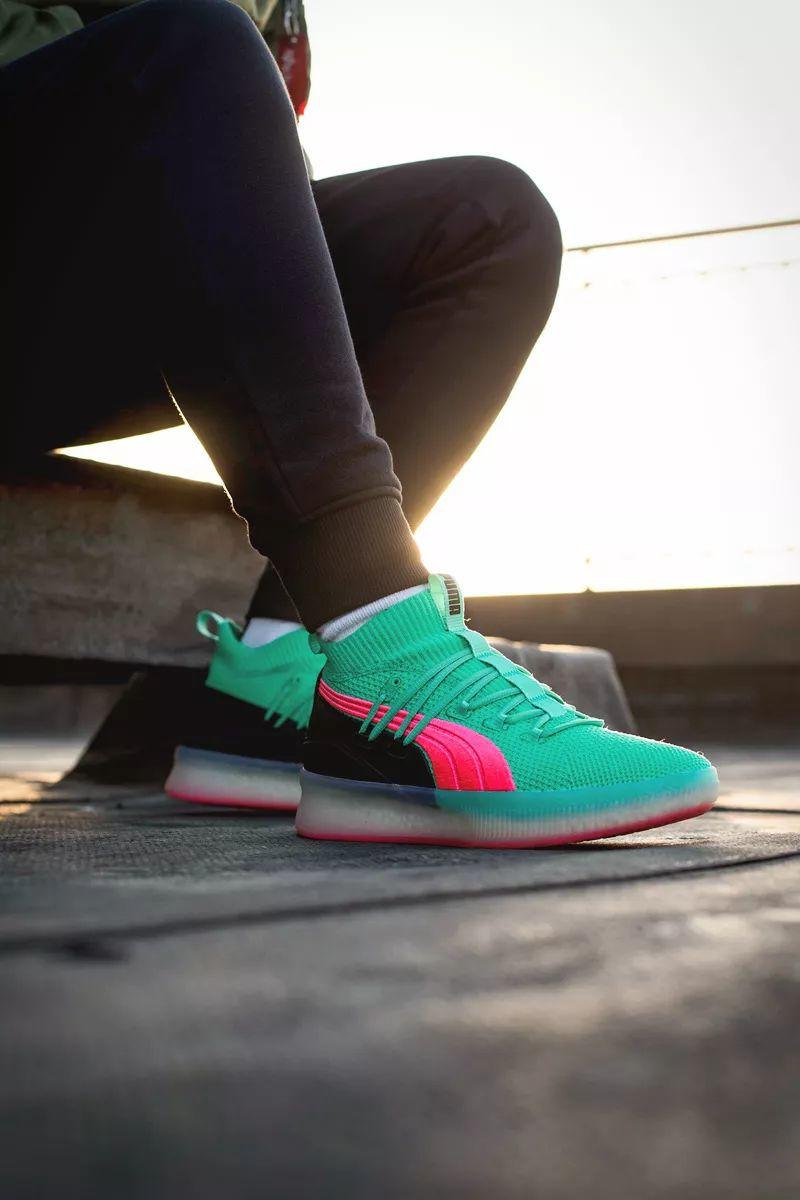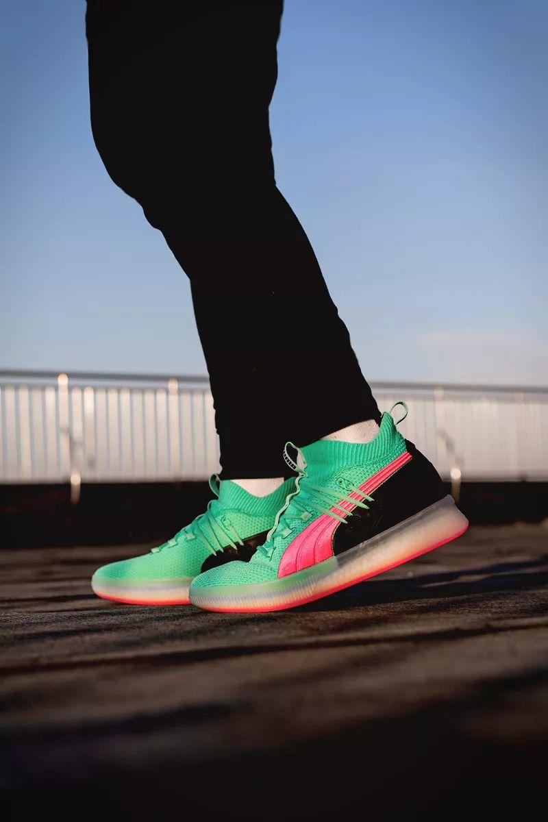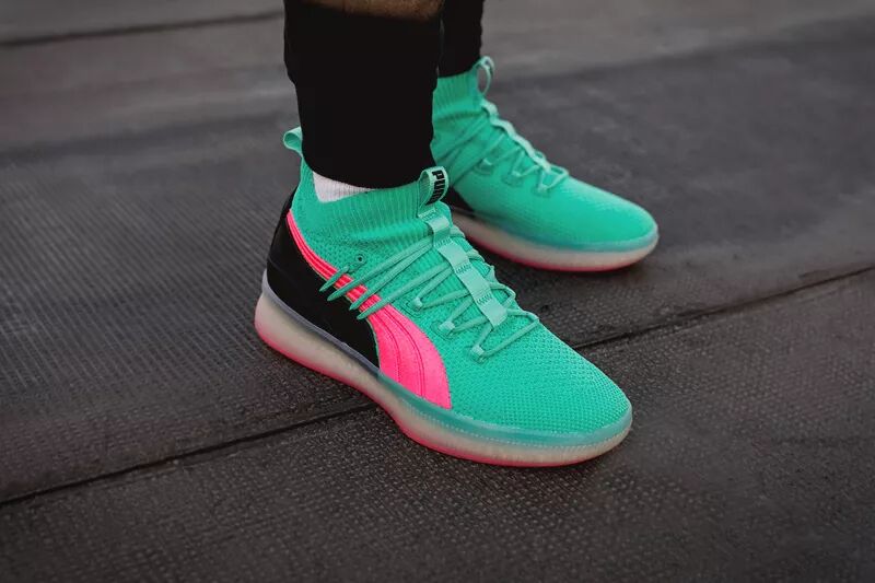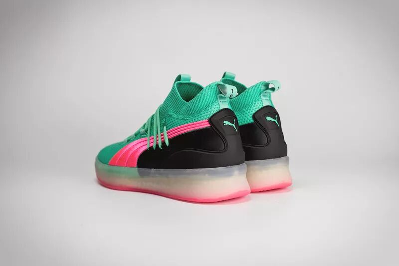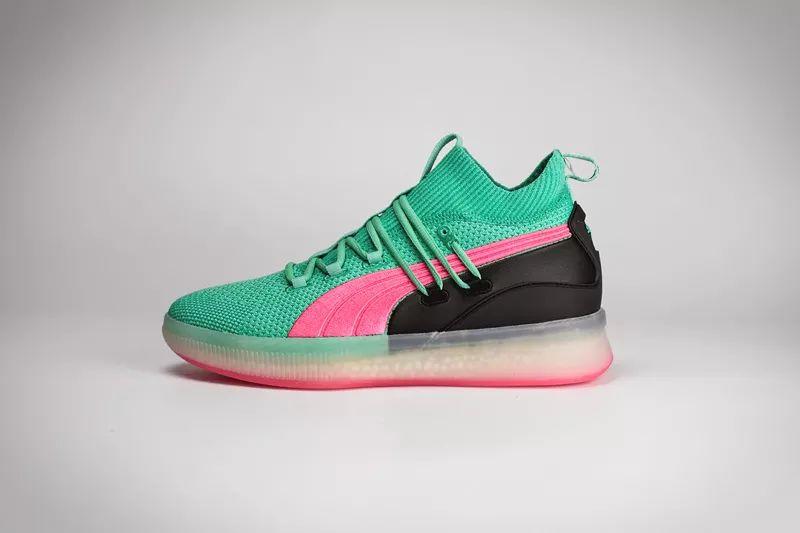 这次以配色风骚著称的 PUMA Clyde Court 就带回了这种色调。大面积湖水绿鞋面搭配粉色 Logo 和外底,带来浓郁南海岸风格。