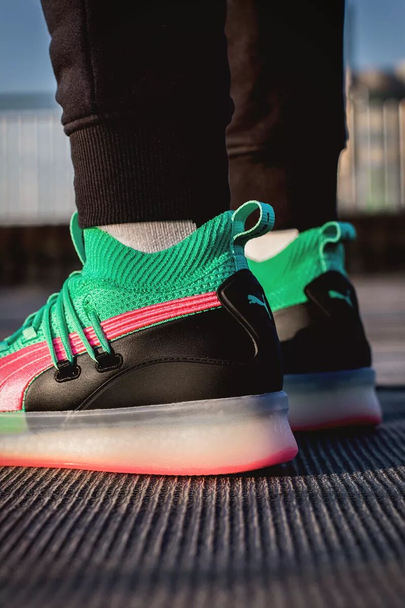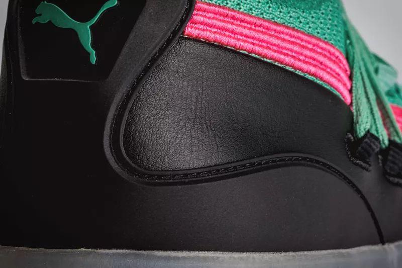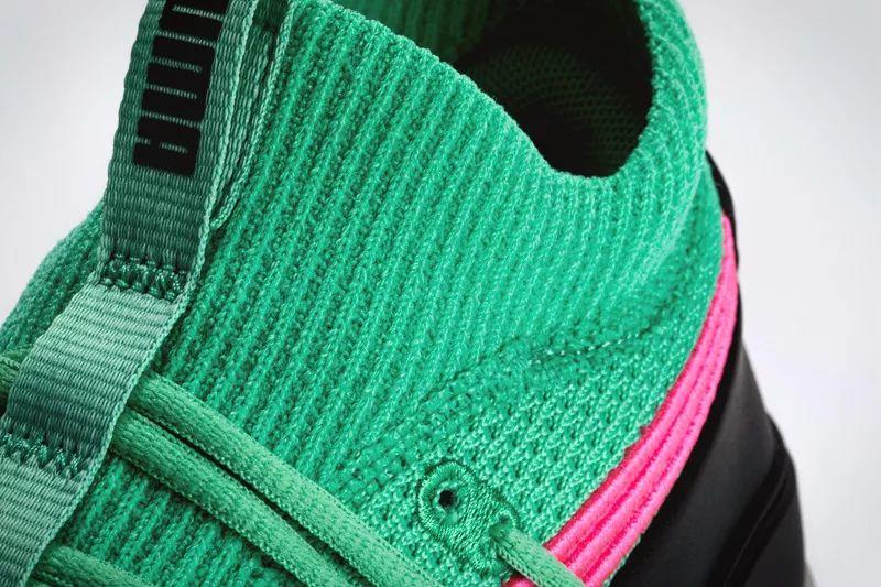 圆润的鞋头和扁平修长的流线型轮廓都极具 PUMA 的复古美学风格。而如今改进为一体编织设计,更令这种轮廓展现出犀利的一面。