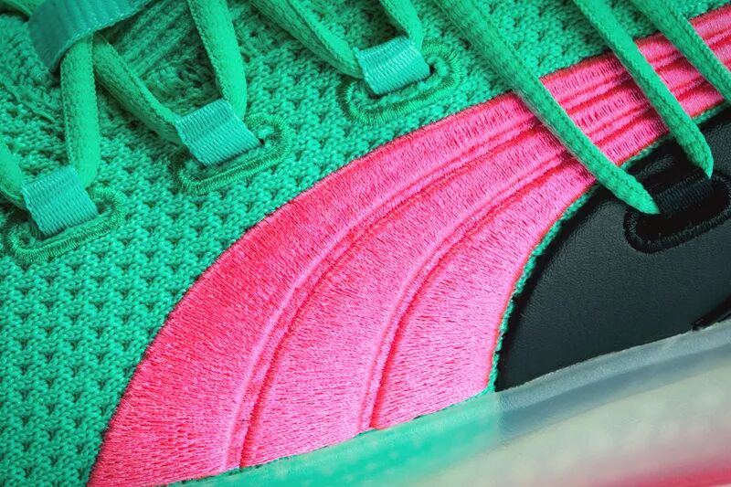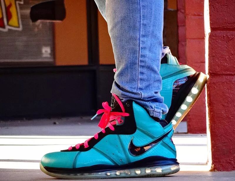 当年詹姆斯转投热火,Nike 就以迈阿密为主题推出了南海岸配色 Lebron 8,以湖水绿搭配粉色,带来火辣的热带风情,成为玩家们心中风骚配色的代表。