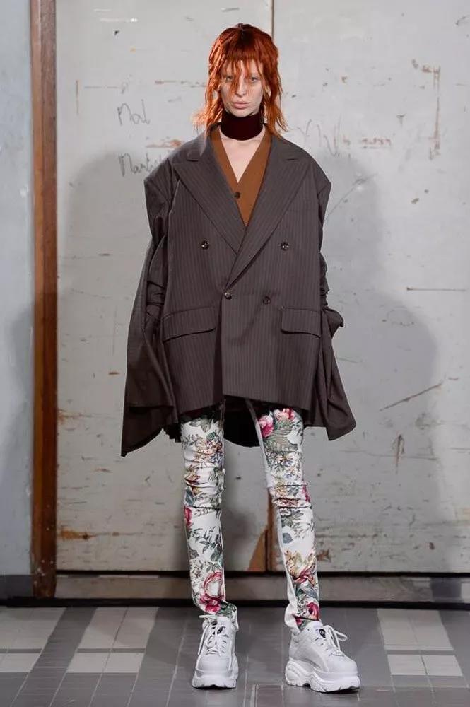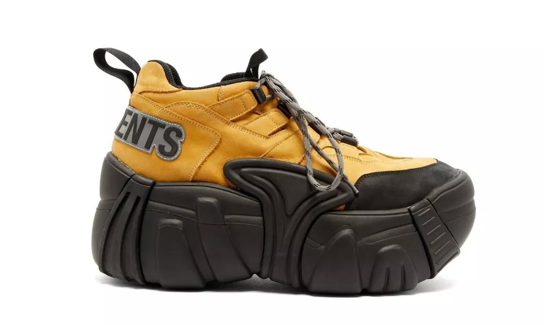 时间倒回到 2018 秋冬系列的 VETEMENTS 走秀上,品牌除了推出了和 Maison Margiela 招牌的 Tabi Boots 相似度高达 90% 的鞋子之外,秀场上与伦敦鞋履品牌 SWEAR 合作推出的超厚底鞋款也算是通过极具视觉冲击力的外观吸引了不少人的眼球,我们当时也通过一篇文章有过详细介绍,不过我猜 “怪” 和 “丑”,就是它给各位留下的最大印象吧…