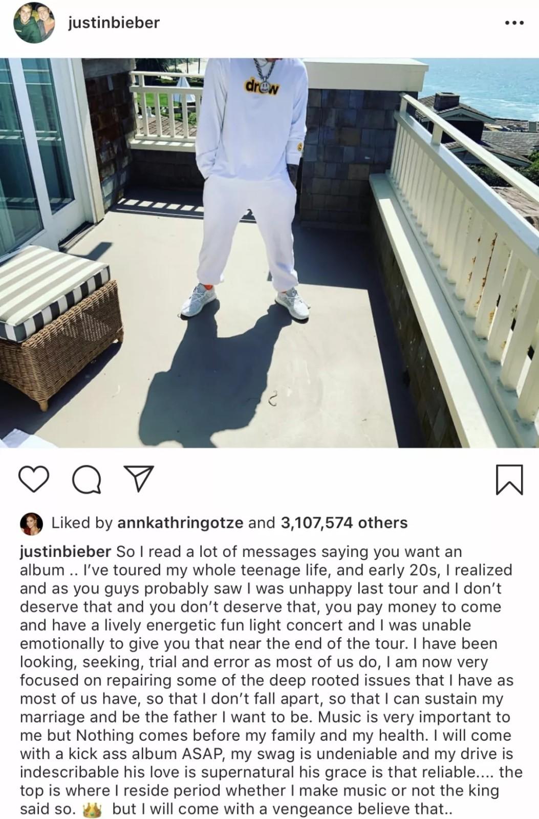 Justin Bieber 较早之前于 Instagram 宣布,将暂停自己的音乐事业,同时也通过长文对乐迷们做出了解释。想必这也是 Justin 经过抑郁症治疗后,想努力改变的一番决定,作为粉丝的我们,只要表达鼓励和支持