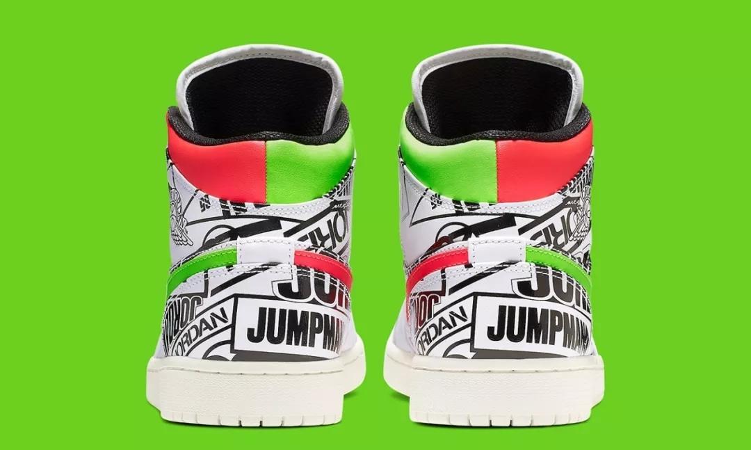 整体以白色为基底,在鞋身布满与 Jordan Brand 有关的涂鸦元素,鞋跟处的红色和绿色 Swoosh 点缀出夏日色彩,抢眼的设计与之前的 Mid 配色大为不同