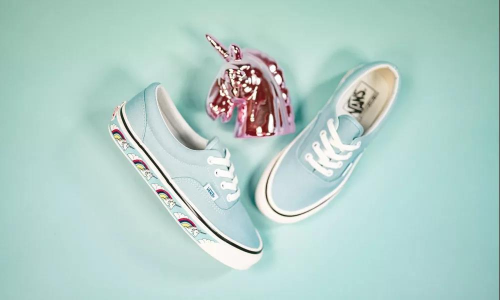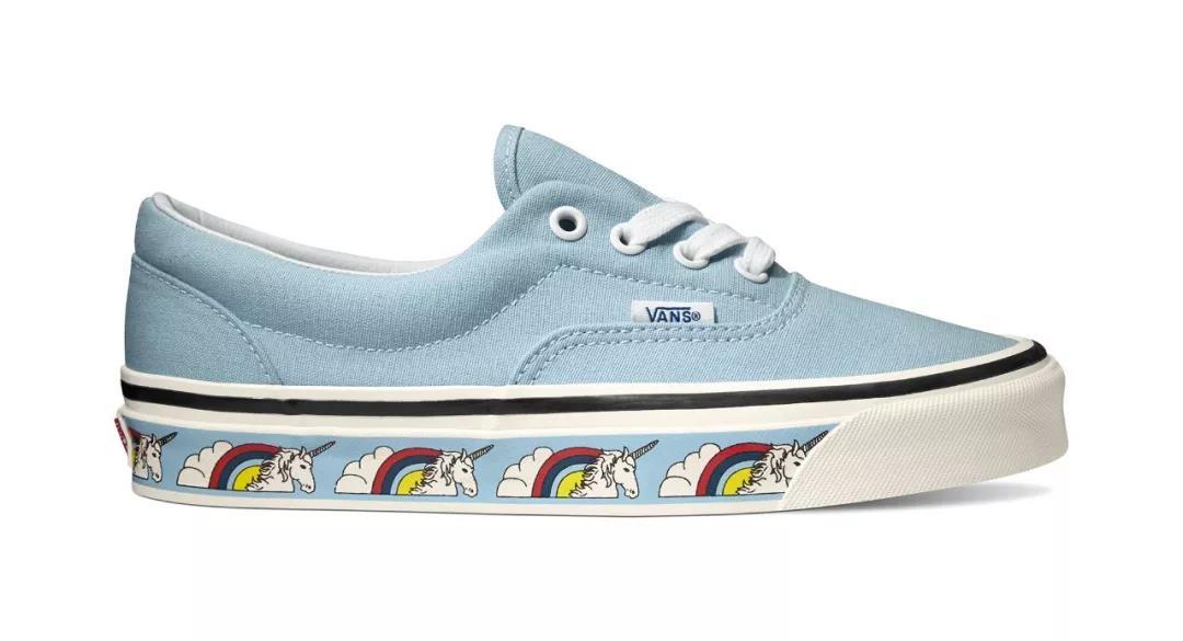 推荐理由:这双Vans Era采用天蓝色的帆布打造鞋身,除了原汁原味的工艺细节外,鞋侧包边上充满创意的彩虹独角兽印花,是这双经典的滑板鞋趣味十足!