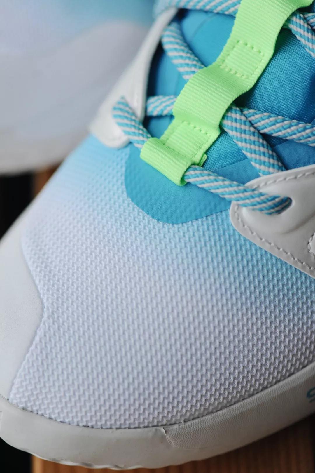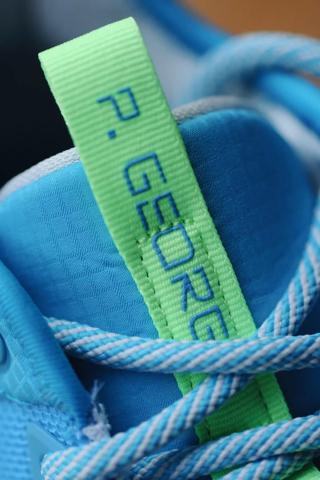鞋身采用湖水绿和浅灰色织物进行塑造迎合了夏日的清新气息鞋舌与鞋后跟分别印有P.GEORGE 和 PG 的个人专属 Logo