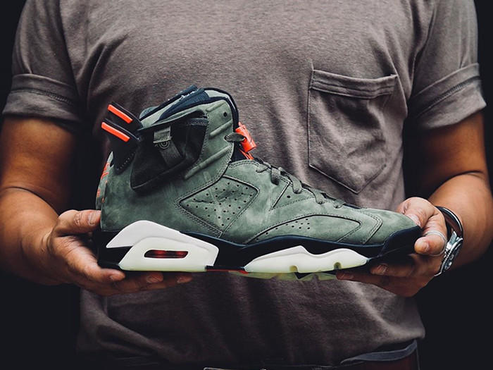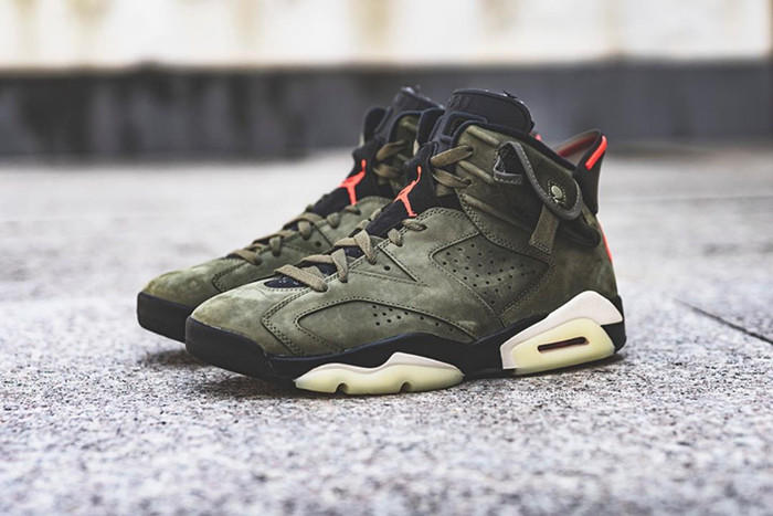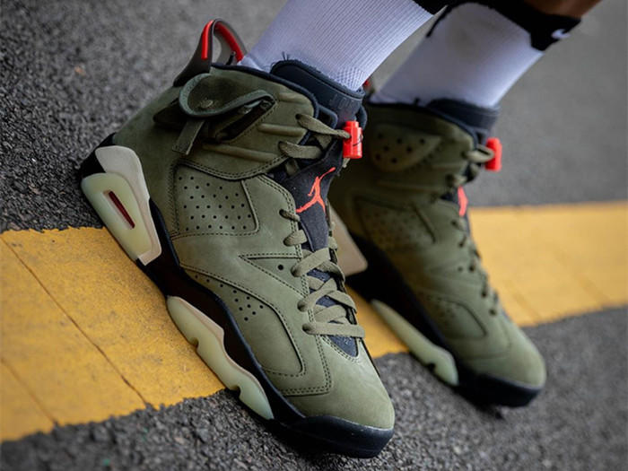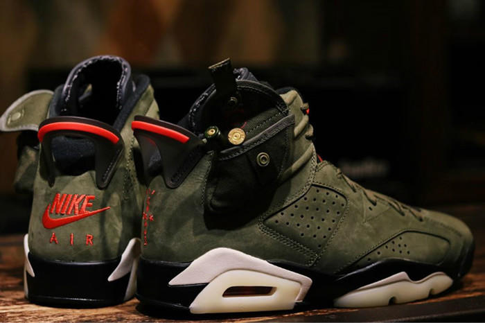 等待了多日之后,这双吸引无数人关注的鞋款就要与大家见面了。鞋款以经典的Air Jordan 6为基础,使用了Travis Scott 个人偏爱的橄榄绿色作为主色调,最大的特点是鞋帮处加入了帆布口袋的设计,除了致敬之外,内部还有Travis Scott的鬼脸Logo, “Cactus Jack” 的厂牌标识继续位于后跟的位置。